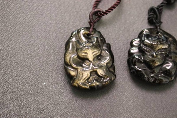 Mooie gouden obsidiaan nine tailed fox hanger met koord in verstelbare hoogte. Bij aankoop ontvang je één van de twee hangers van de afbeeldingen.