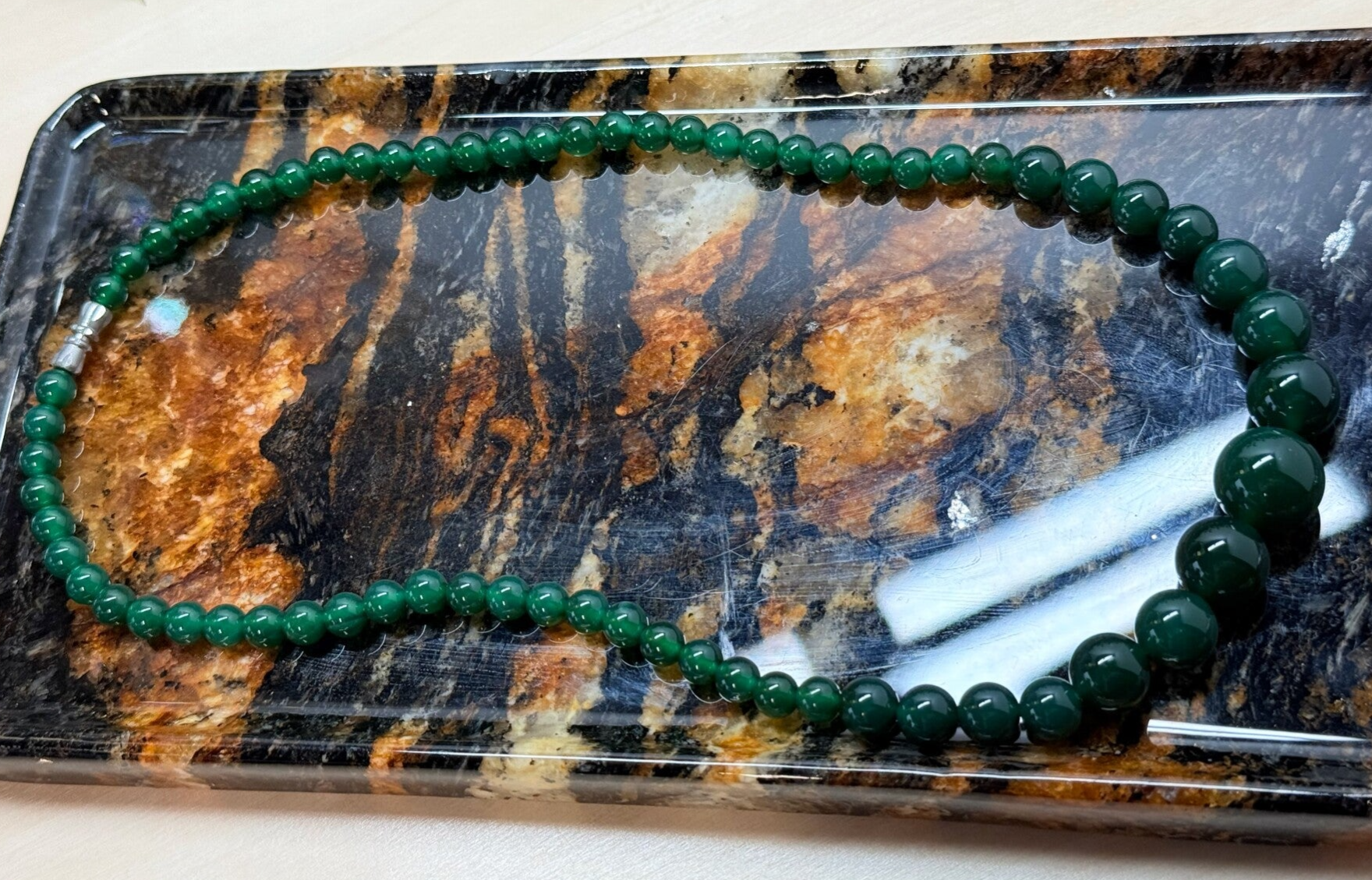 Groene agaat ketting met kralen in diverse afmetingen variërend van 6 mm tot 14 mm en lengte van 47 cm. Leuk voor de kerst. De ketting heeft een niet verstelbare sluiting.