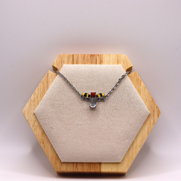 Armband met bijtje en bergkristal. Met schattige details zoals twee kleine robijnsteentjes als versiering. De armband is gemaakt van rvs en heeft een verstelbare sluiting.