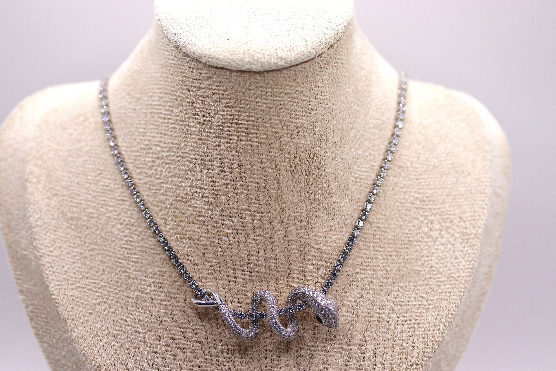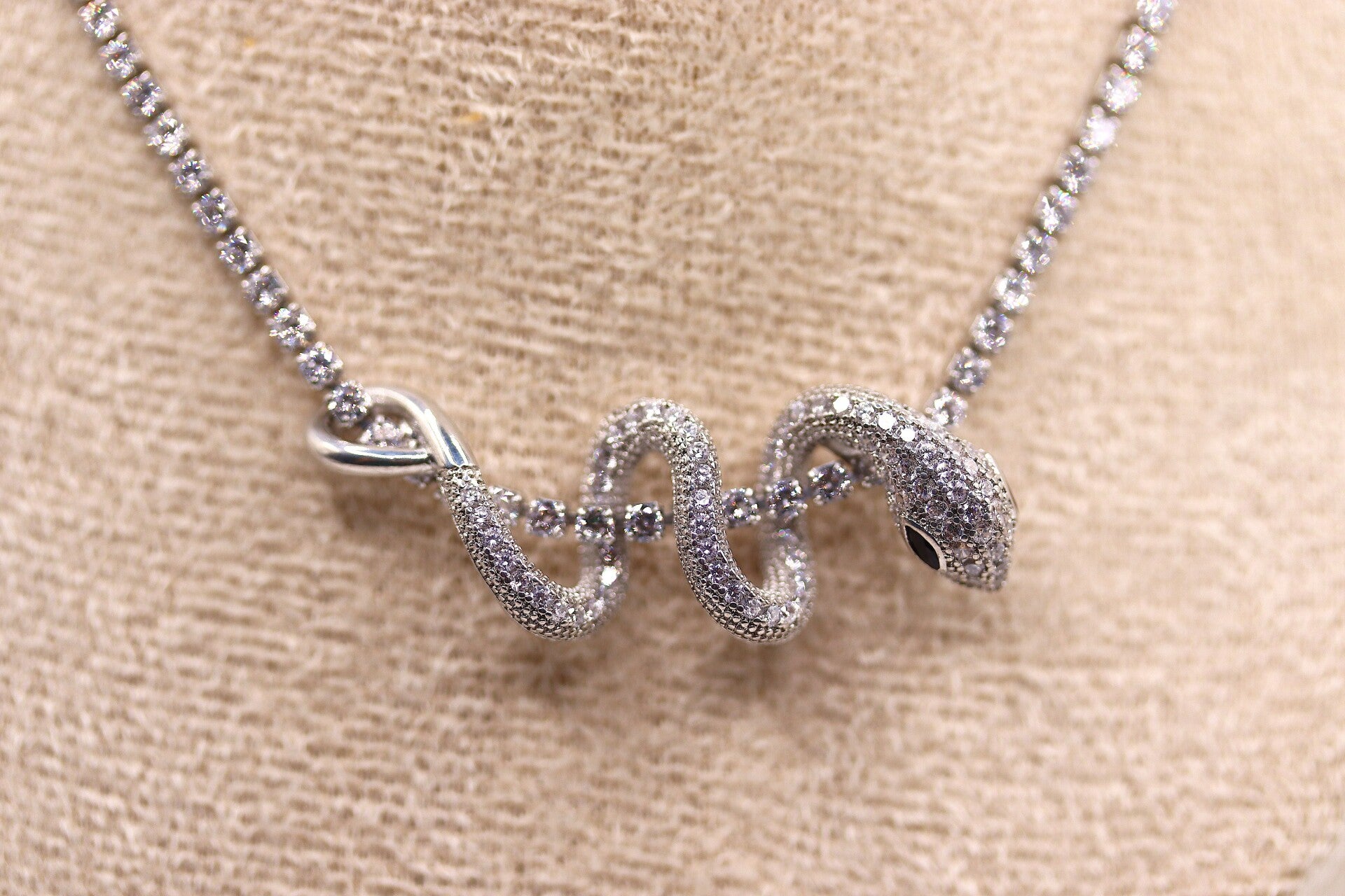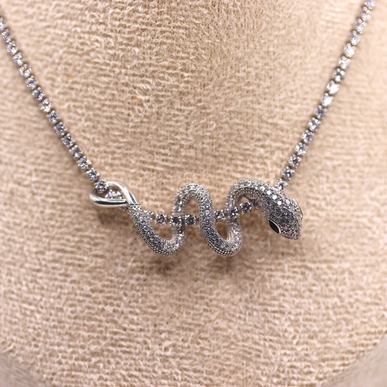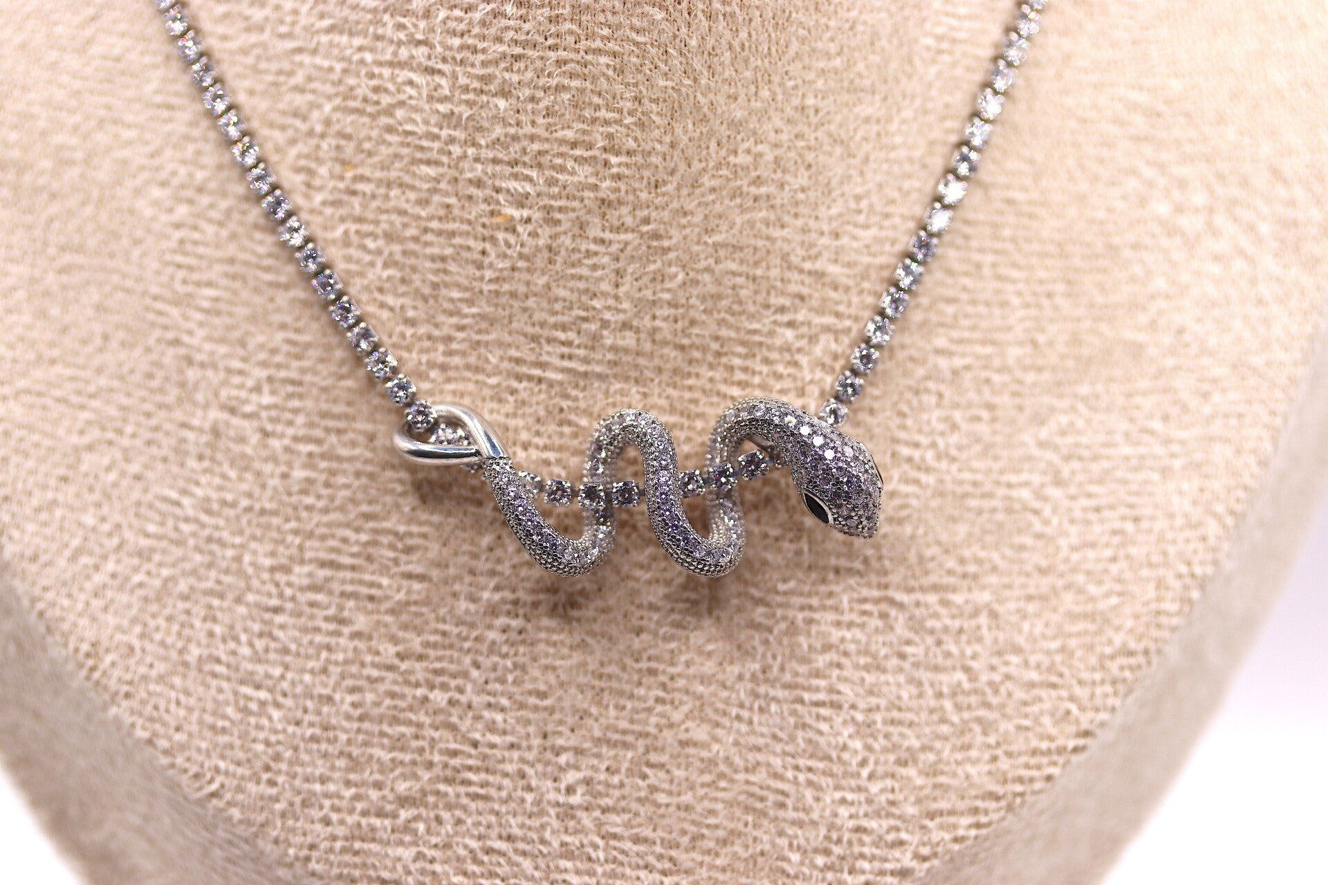 Stoere ketting met een slang als hanger. Er zijn zirkonia steentjes ingelegd over de hele ketting en heeft een lengte van zo een 40 - 45 cm. De sluiting is verstelbaar in lengte.