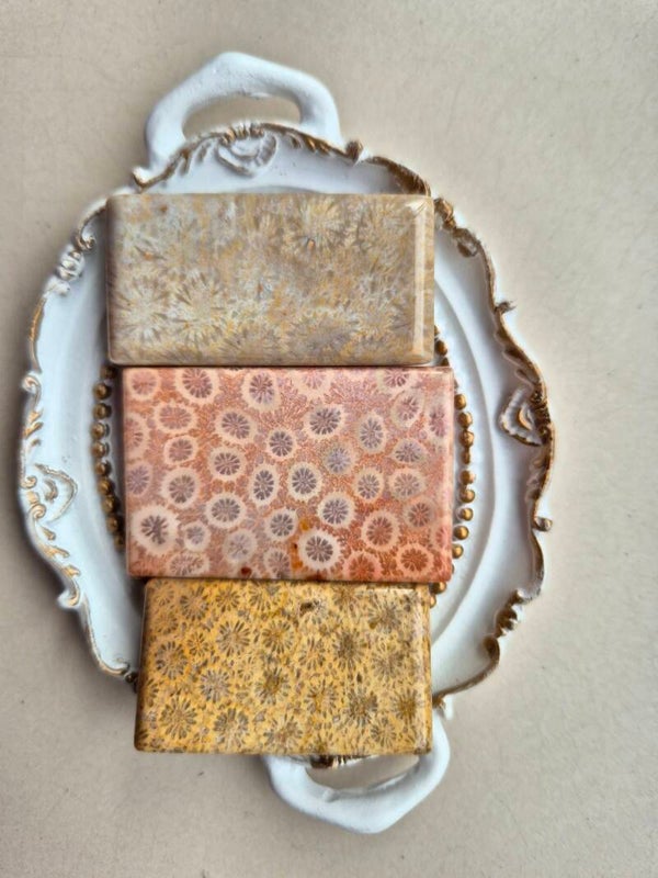 Drie gepolijste fossiel koraal stukjes in rechthoekige vorm. Met mooie patronen. Je zou er een gat in kunnen boren en als hanger gebruiken of ter decoratie of verzamelobject gebruiken.