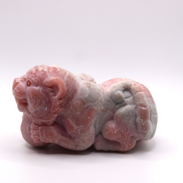 Geweldig beeld van een tijger gemaakt uit roze opaal. Het beeld heeft een lengte van 10 cm. De foto's spreken voor zich.