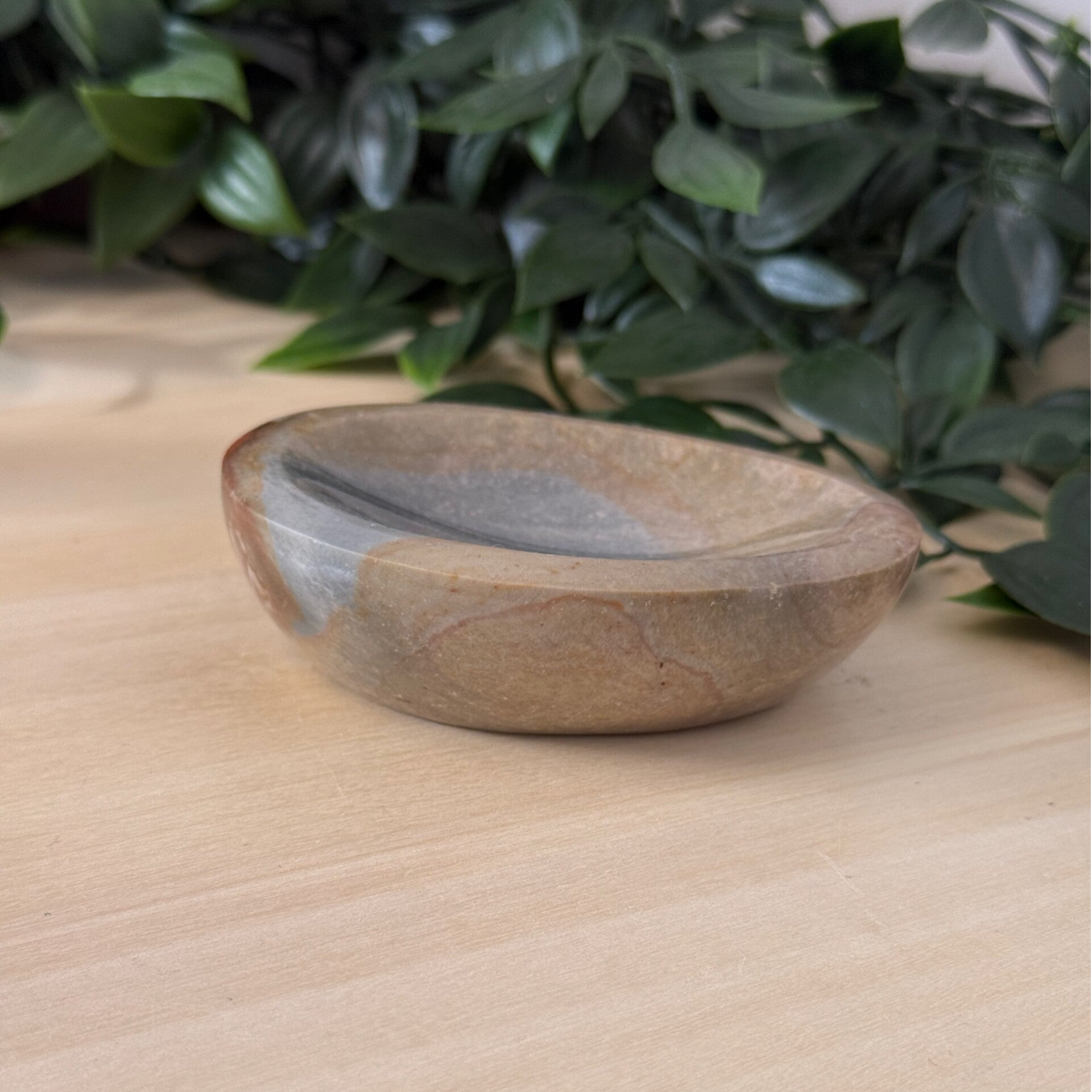 Een handgemaakt bakje van polychroom jaspis van 8.5 x 2.5 x 6 cm. Polychroom jasper wordt gevonden in Madagaskar. Polychroom jaspis heeft een combinatie van de kleuren rood, geel, blauw, beige, wit, grijs, groen en zwart.