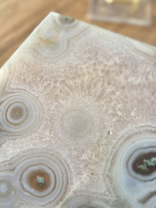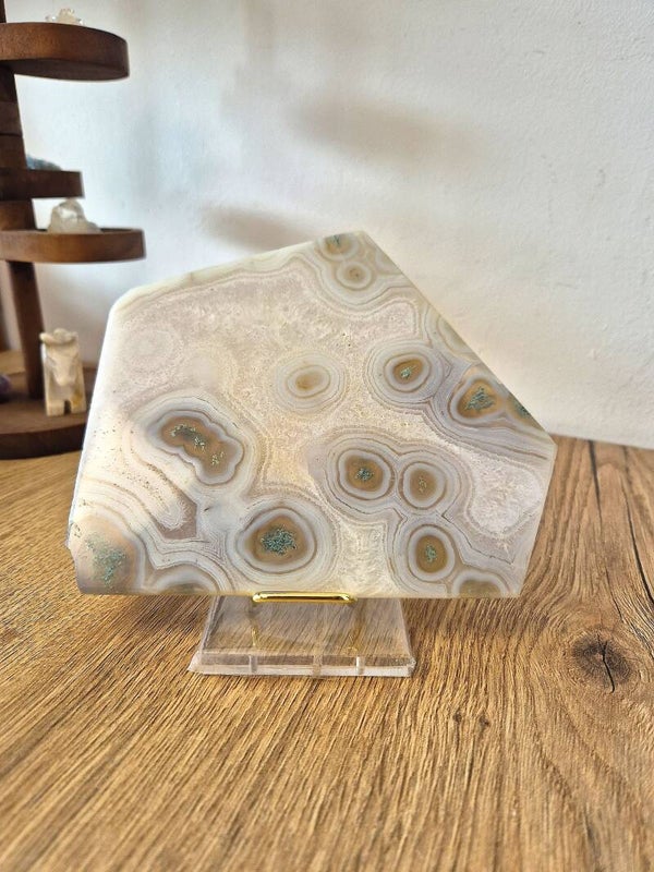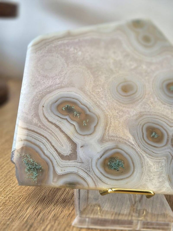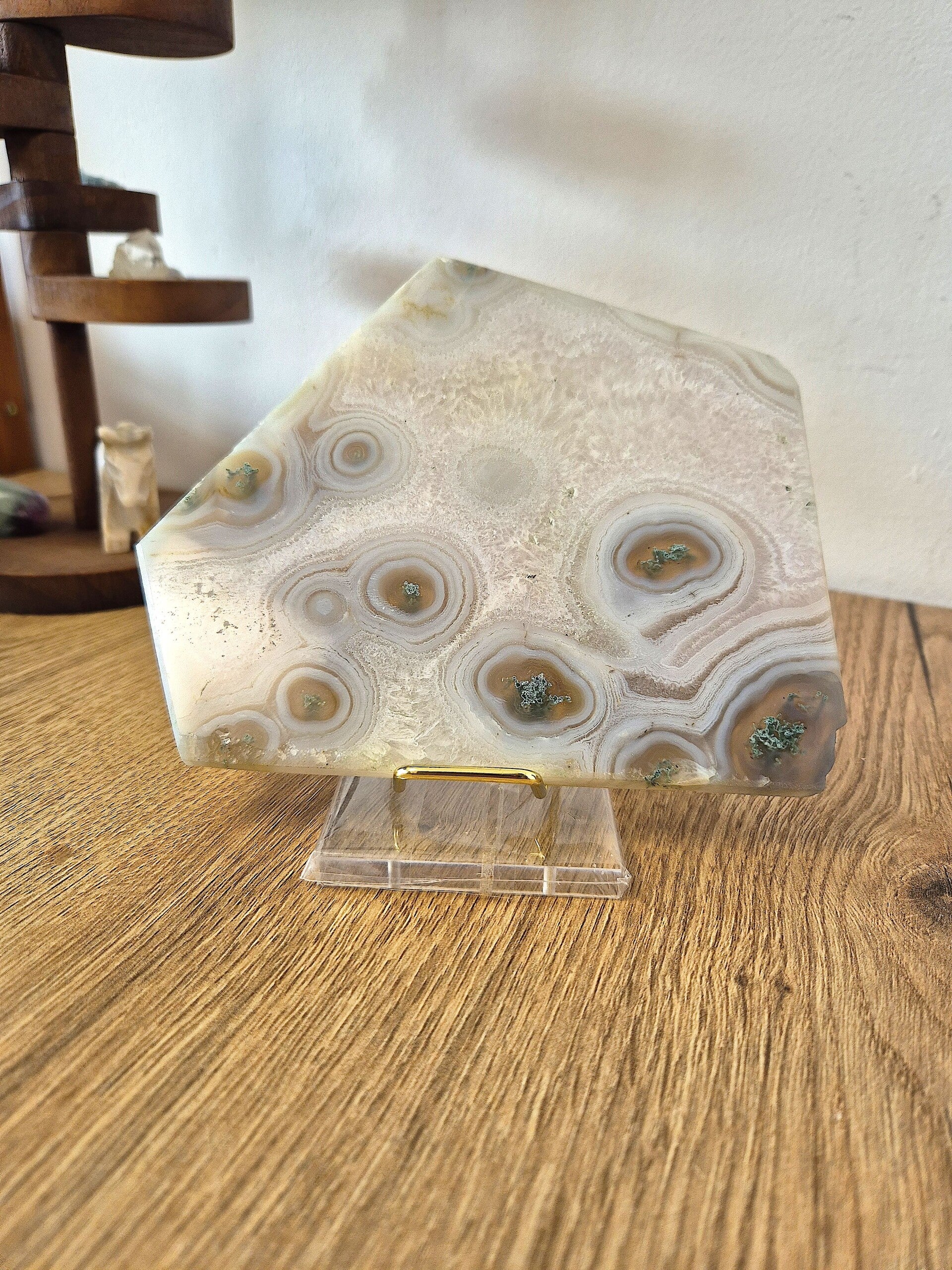 Prachtige plak van witte mosagaat. De plak / slab heeft de afmeting van circa: 17 x 15 x 1 cm en weegt tegen de 460 gram. De metalen houder die krijg je bij aankoop erbij.