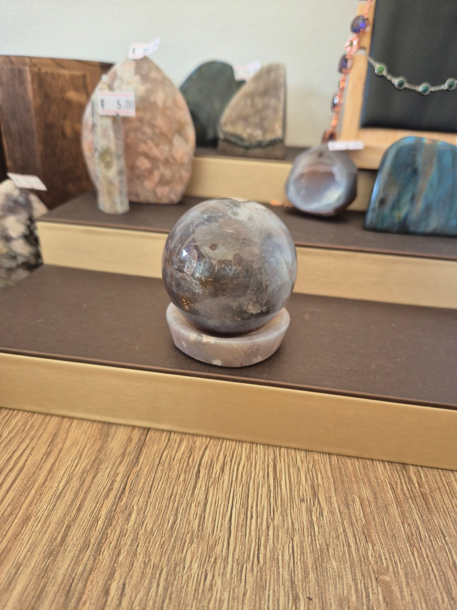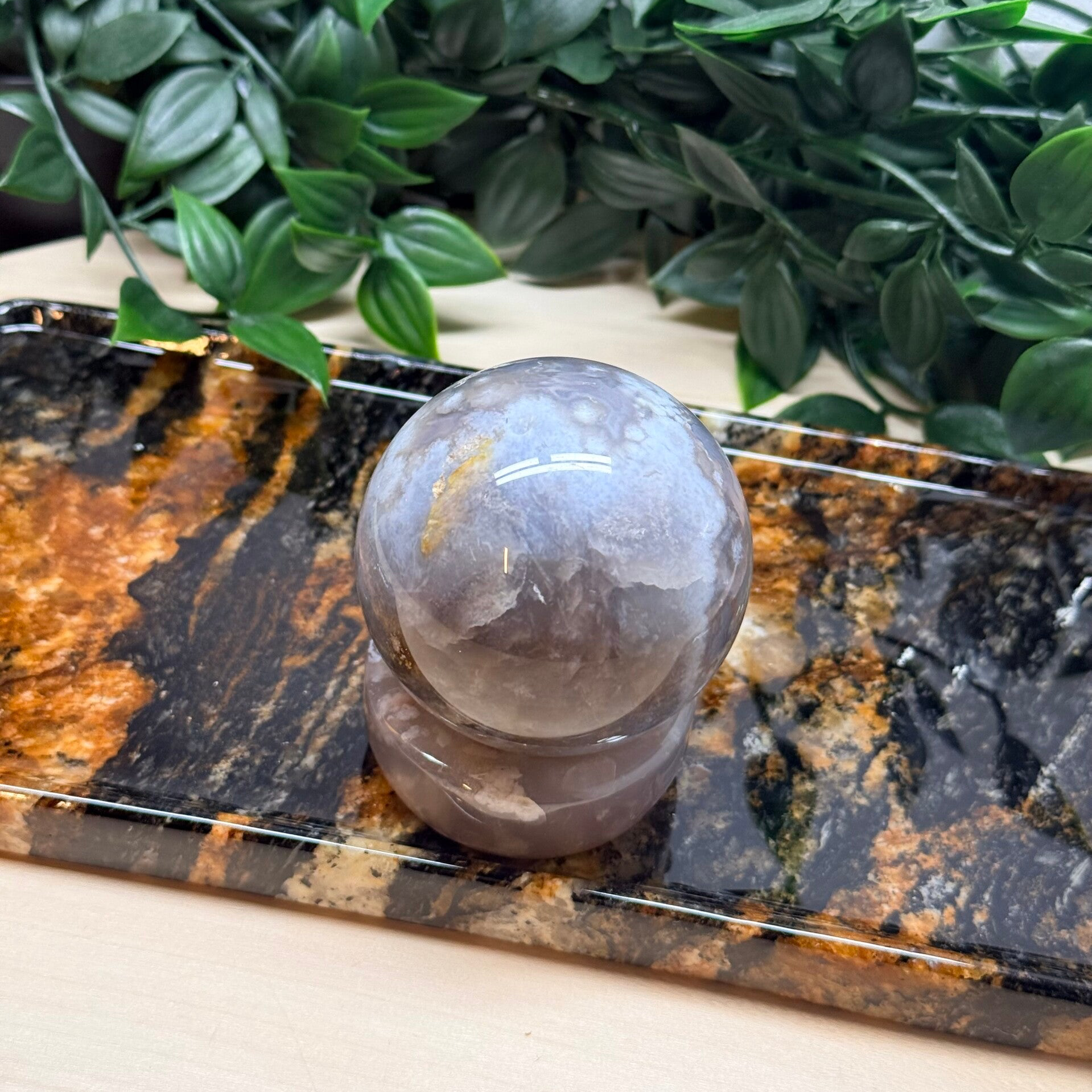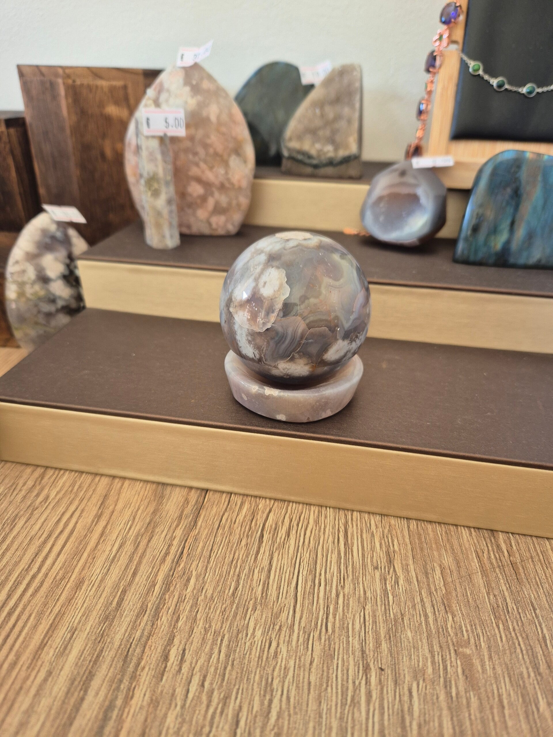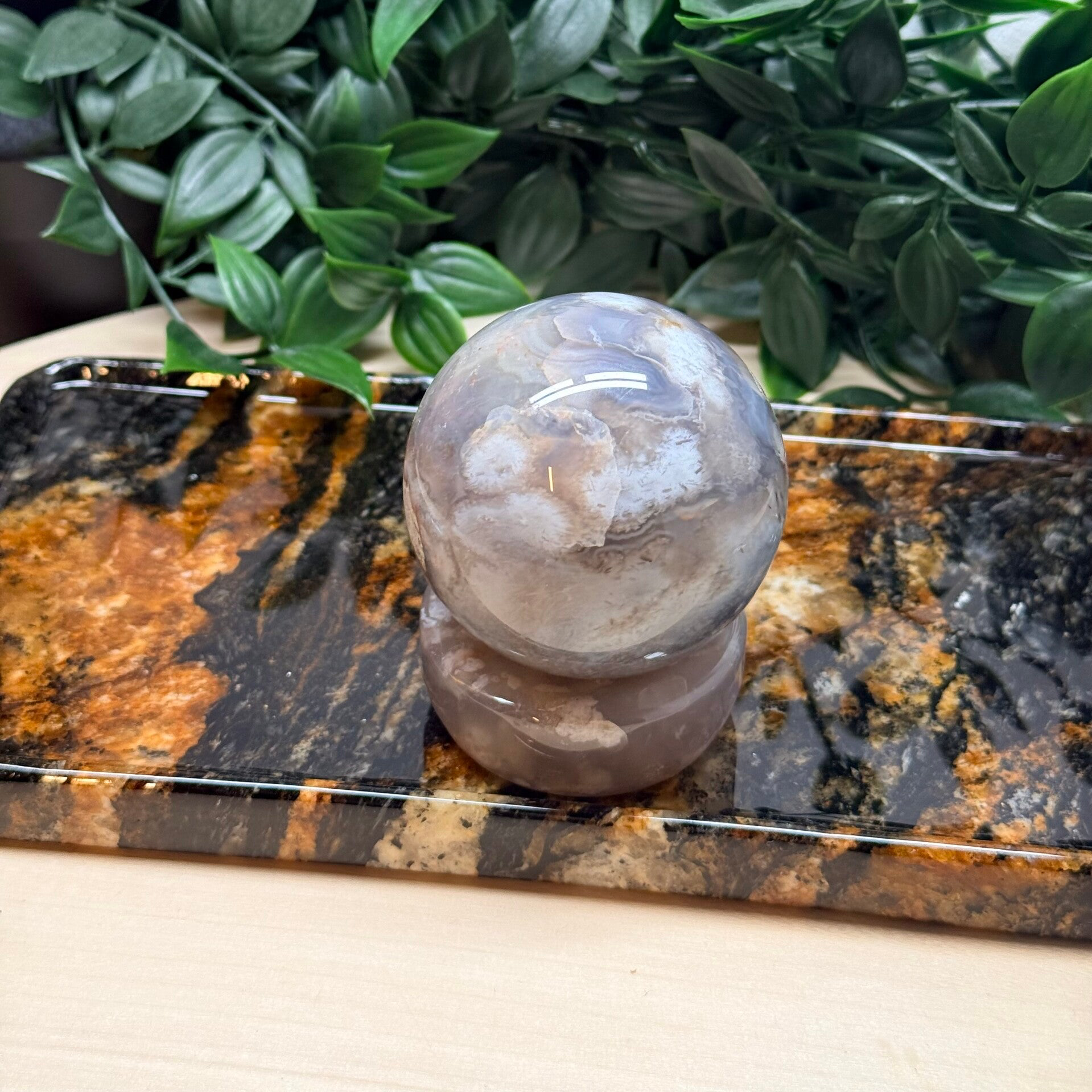 Zwarte bloemagaat bol van 6 cm. De bol weegt 270 gram.