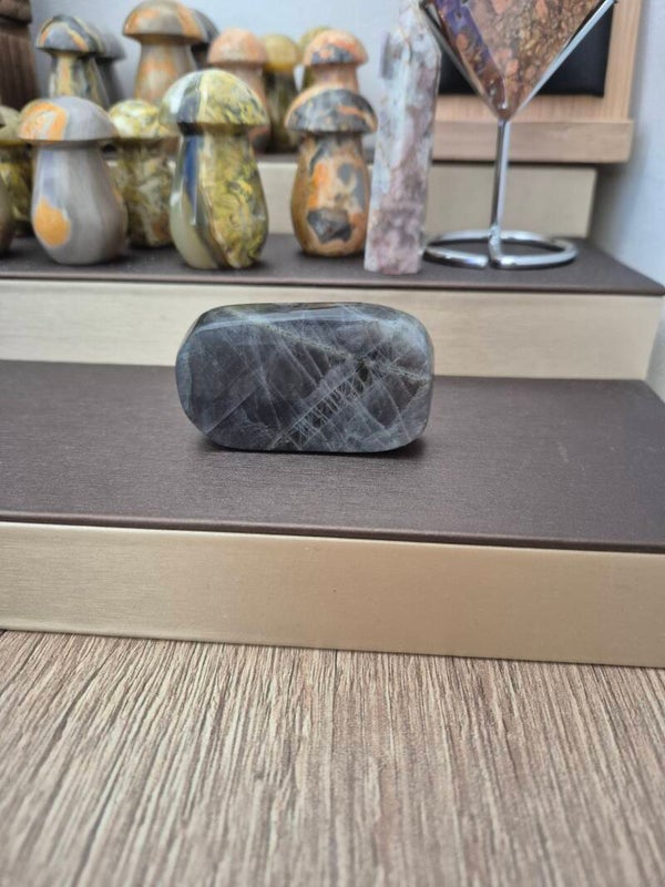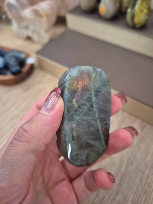 Mooie labradoriet steen met paars roze glans. Het stuk weegt 87 gram en heeft afmeting van 6.3 bij 3.6 cm. Het mineraal labradoriet behoort tot de veldspaten. Labradoriet komt voor in meerdere kleuren. Meestal is de steen grijs met een blauwe of gele glans. De steen kan ook oranje, roze of paarse glans hebben. Het mineraal komt voor in Canada. Hier is het ook voor het eerst gevonden in 1770. Finland kent overigens een variant van Labradoriet met een net zo mooi kleurenspel. Deze variant wordt spectroliet genoemd. Sinds de vondst in 1770 werd Labradoriet vooral heel populair voor het gebruik van sieraden. Tegenwoordig komt Labradoriet nog steeds uit Labrador, maar het wordt ook gedolven in Finland, Australië, Duitsland, Costa Rica, Madagaskar, Noorwegen, Rusland, China, Mexico en de Verenigde Staten. Spiritueel: Labradoriet vermindert angsten en onzekerheid. De steen beschermt de drager tegen invloeden, indrukken, prikkels en negatieve emoties van anderen. Ook helpt het je een betere nachtrust te hebben.