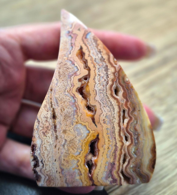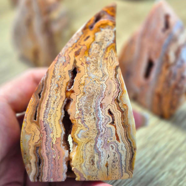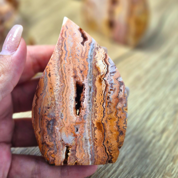 Elke Crazy Lace Agaat free-form is uniek. Geen twee zijn hetzelfde. De steen wordt gevormd in de aarde over miljoenen jaren, waarbij lagen van mineralen zich opstapelen tot een kleurrijk mozaïek van crème, roest, geel, grijs en soms zelfs roze. Bij DIYables.nl vind je deze sculpturen in een handig formaat van 8–10 cm hoog, perfect voor op een plank, bureau of nachtkastje.