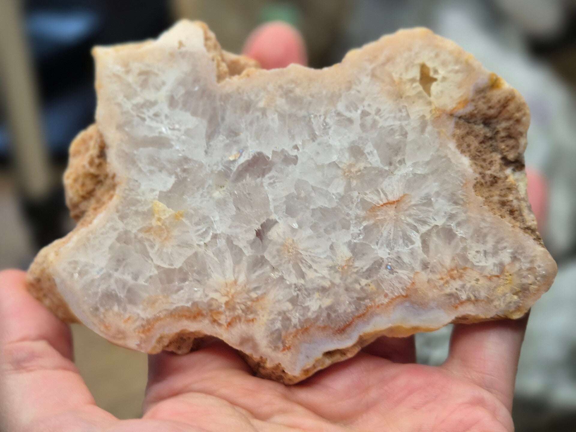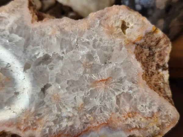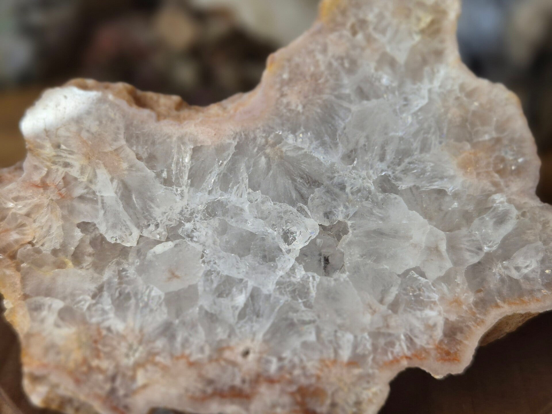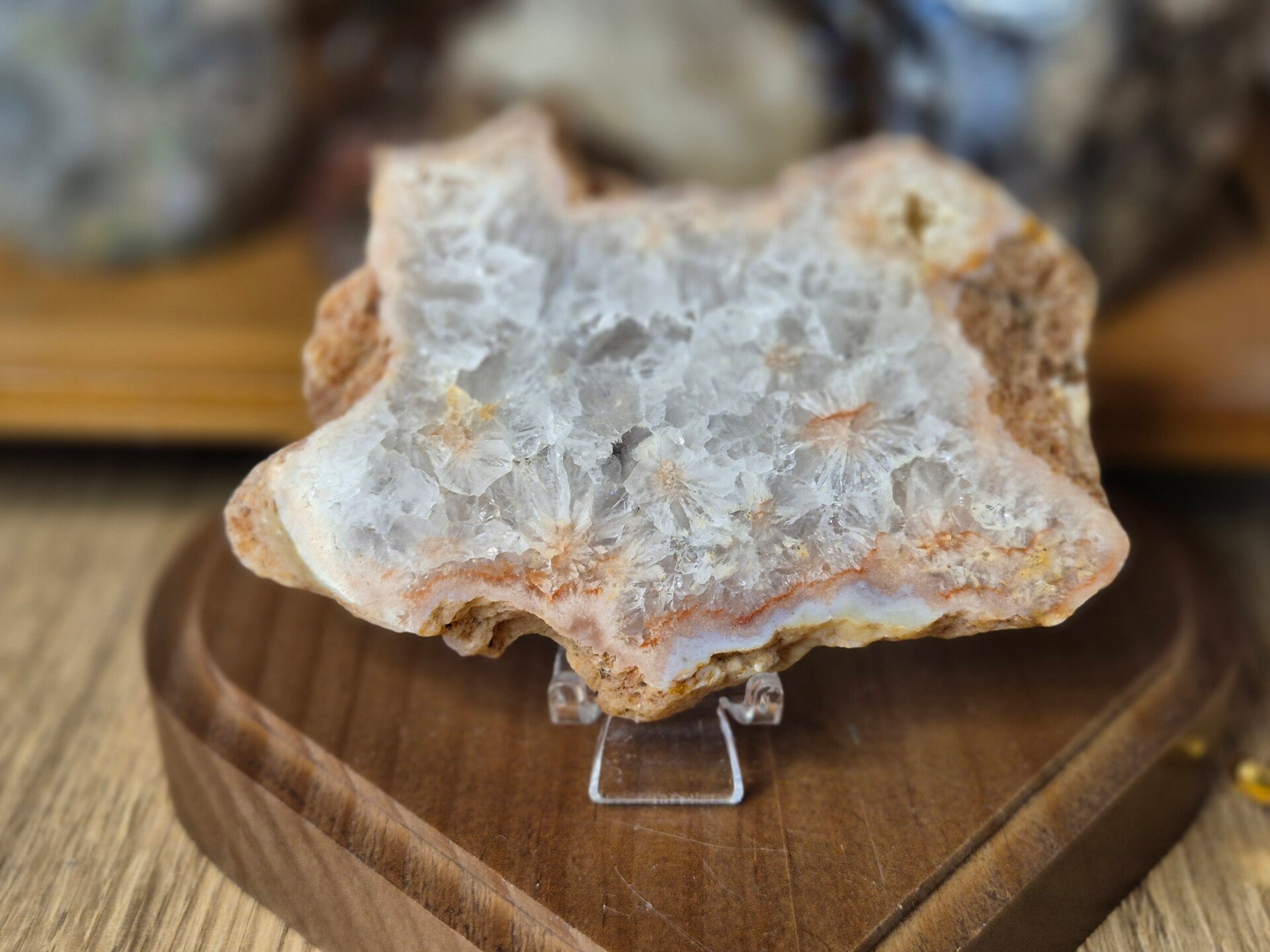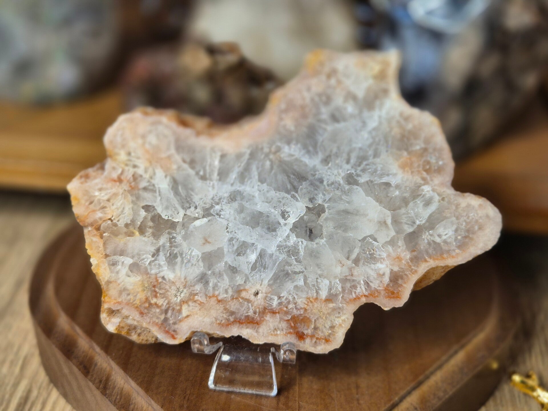 Mooie plak van 195 gram roze amethist met kwarts plekken en mooie patroonvorming. De plak heeft een lengte voor 11 cm. Een houder is erbij te koop voor 3,50 (niet de plastic van de foto).