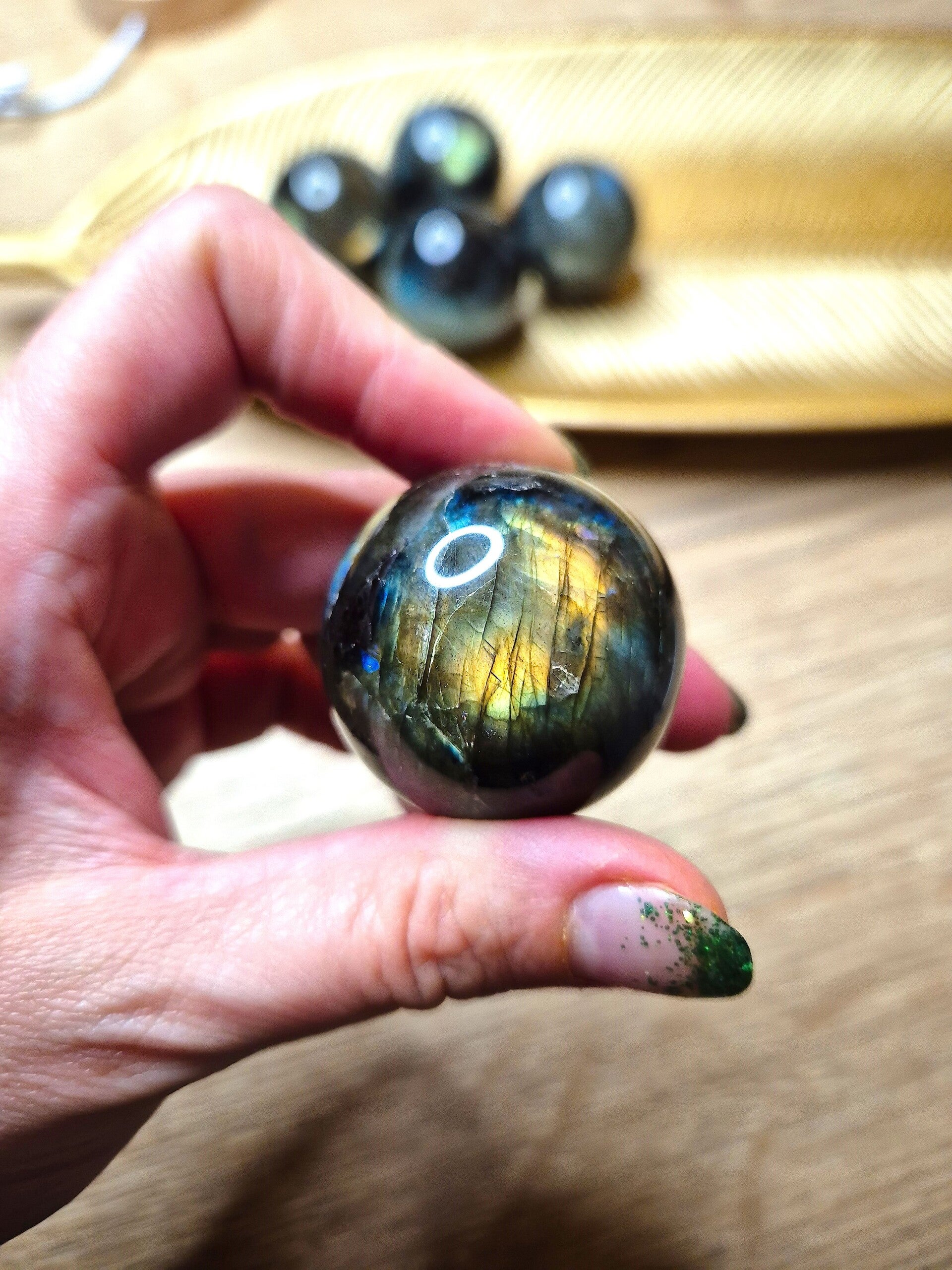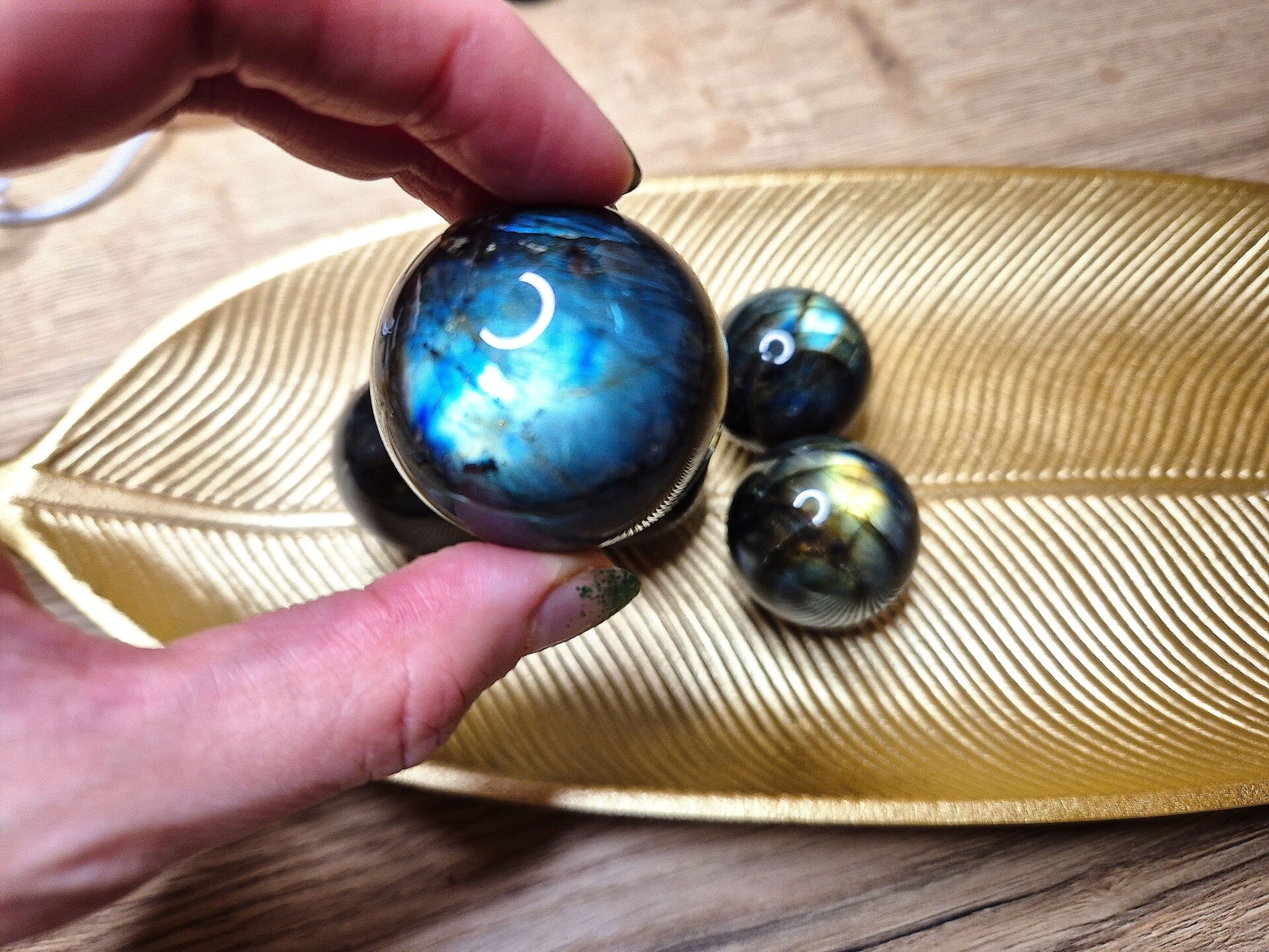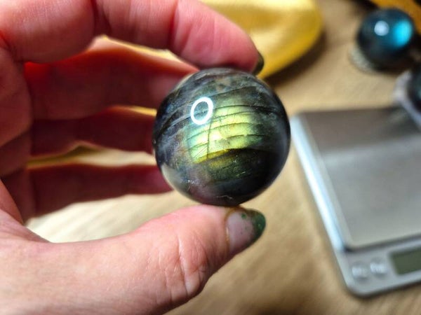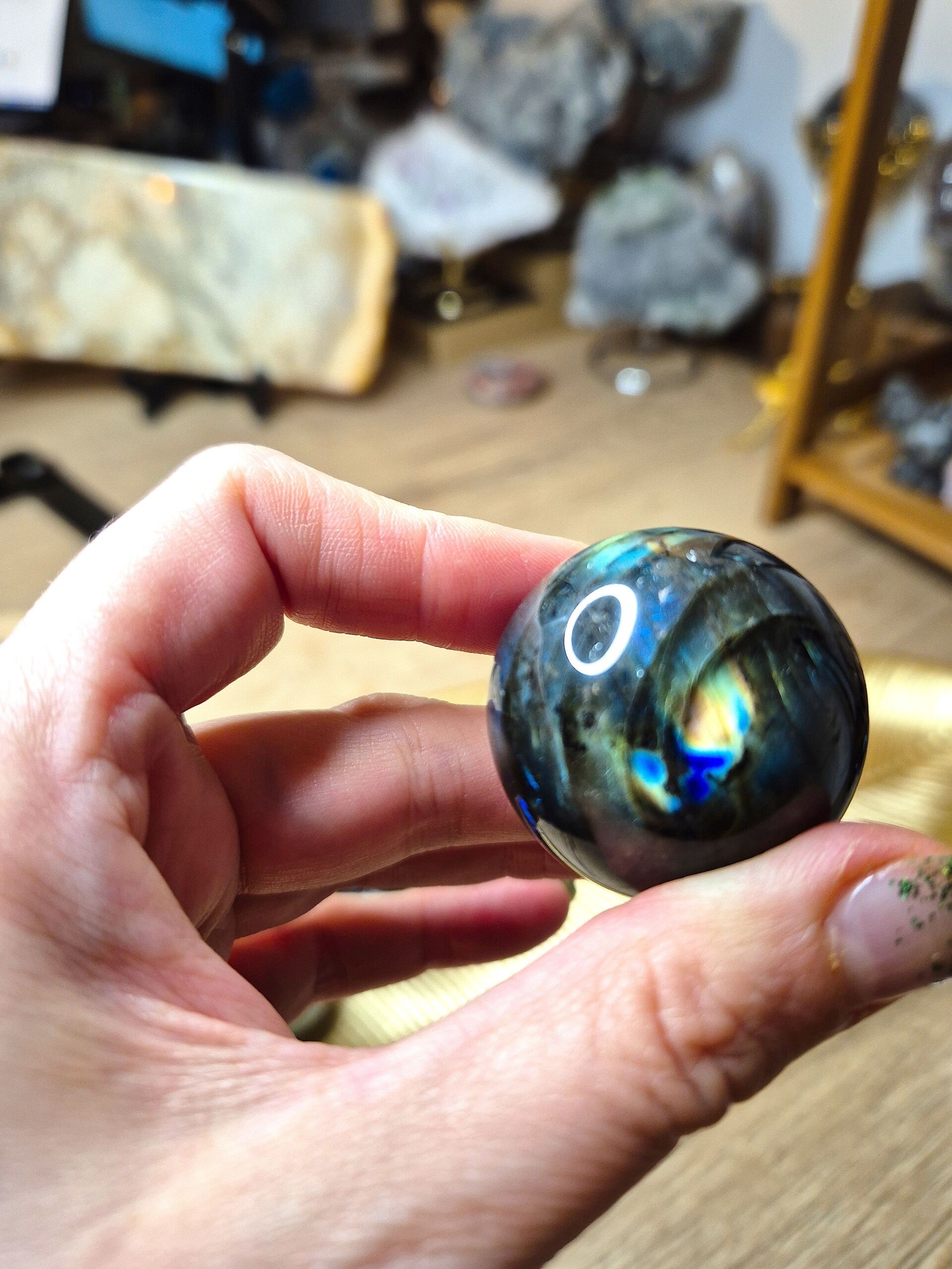 Mooie labradoriet bol met diameter van circa 3,7 cm en blauwgele gloed. Er zitten natuurlijke lijnen in de bol. De bol weegt circa 80 gram. Let op: de bol wordt geleverd exclusief standaard. Bij aankoop krijg je één van de bollen geleverd die op de foto's staan.