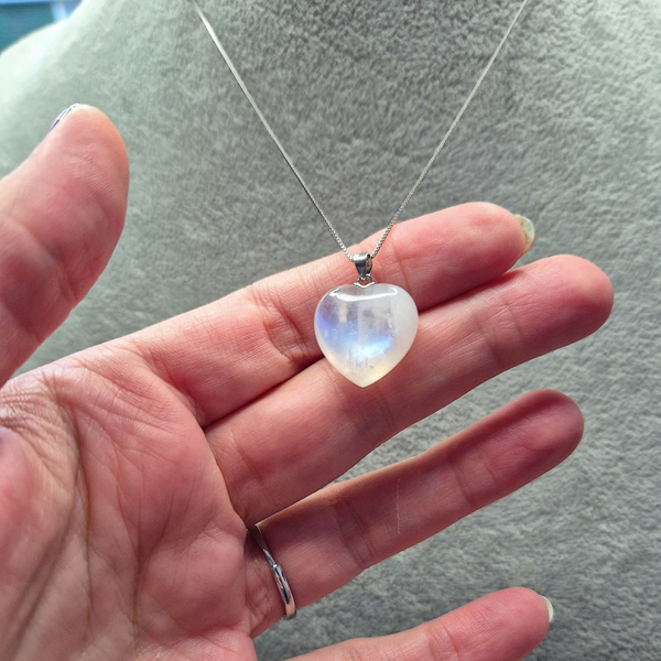Hanger van blauwe maansteen in hartvorm met grootte van 1.7 x 1.6 cm. Deze steen heeft een hele goede gloed en heeft een zilver oogje. Blauwe maansteen, ook wel bekend als blauwe regenboogmaansteen, is een betoverende edelsteen die bekend staat om zijn zachte, iriserende glans en kalmerende eigenschappen. Het wordt vaak geassocieerd met innerlijke rust, intuïtie en emotionele balans. Veel mensen geloven dat blauwe maansteen helpt bij het versterken van vrouwelijke energie en spirituele groei.