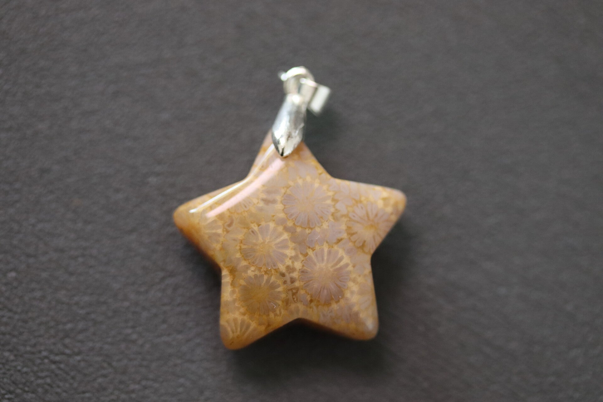Hanger is stervorm met zes armen van fossiel koraal / coral jade. De grootte is 2,6 cm. De hanger kan ook worden verwisseld voor en zilveren exemplaar.