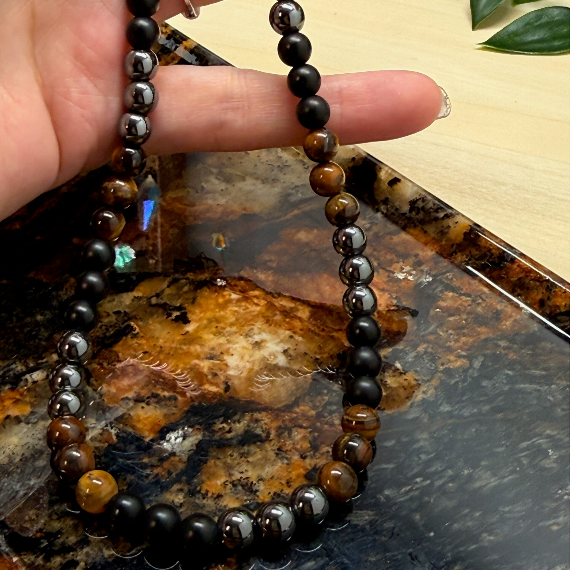 Ketting met tijgeroog. obsidiaan en hematietkralen met lengte van 42 cm. De kralen hebben een afmeting van 6 mm. De ketting is afgewerkt met een niet verstelbare sluiting.