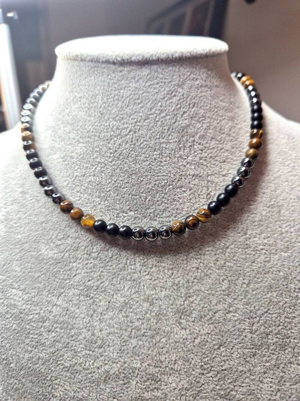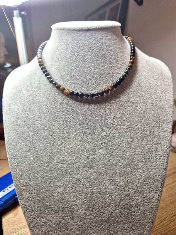 Ketting met tijgeroog. obsidiaan en hematietkralen met lengte van 42 cm. De kralen hebben een afmeting van 6 mm. De ketting is afgewerkt met een niet verstelbare sluiting.