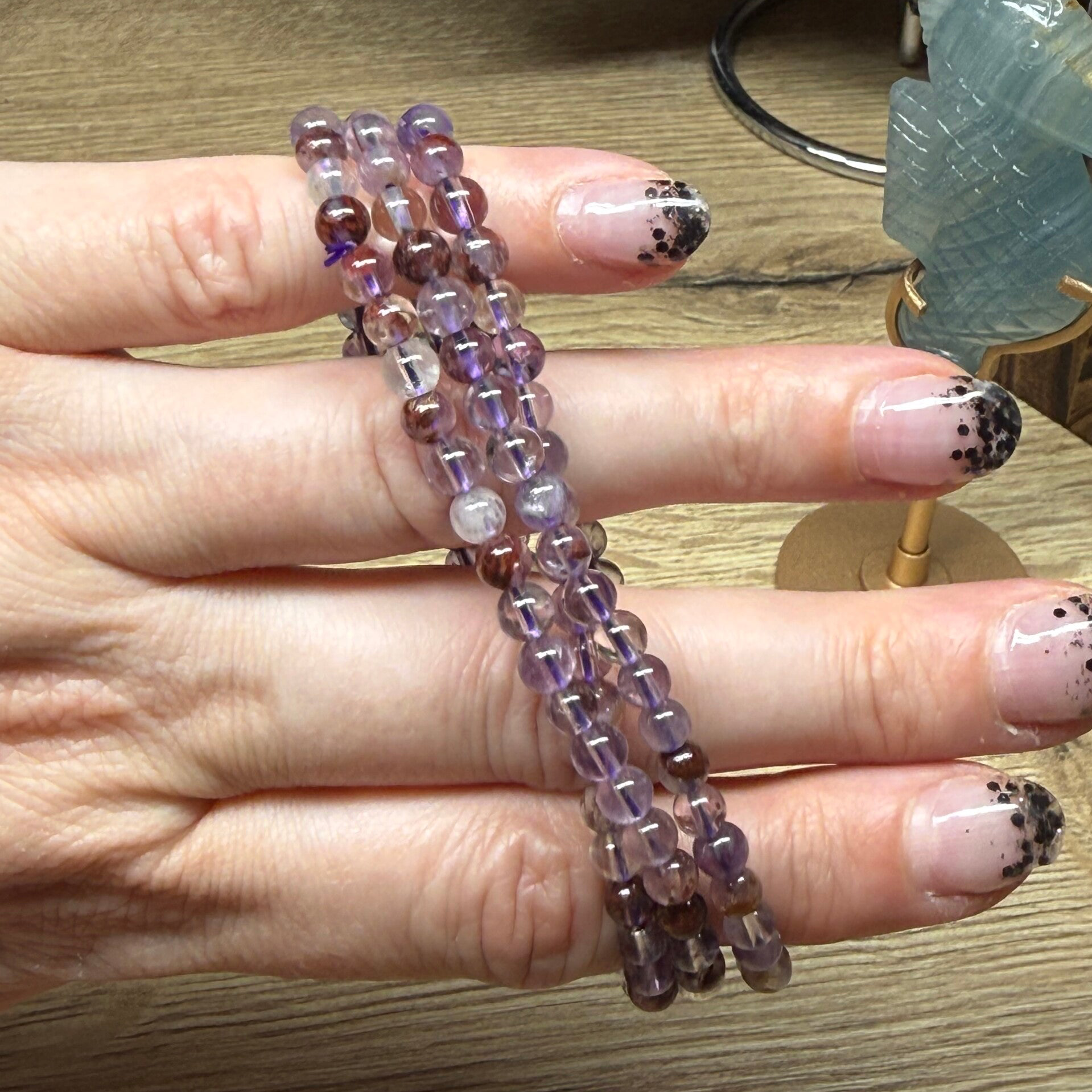Paarse lodoliet of ook wel garden quartz armband met 4 mm kralen. De kralen hebben elk een uniek uiterlijk door de inclusies van mineralen zoals chloriet en ijzer.
