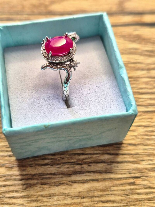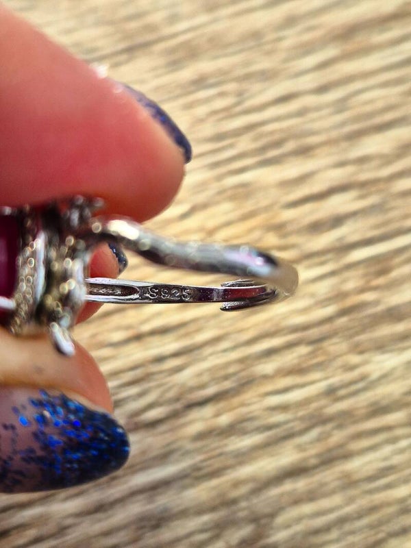 Ring van zilver S925 gezet met een robijn (synthetisch) en zirconia. De ring is verstelbaar en dus voor diverse grootte van de vinger geschikt.