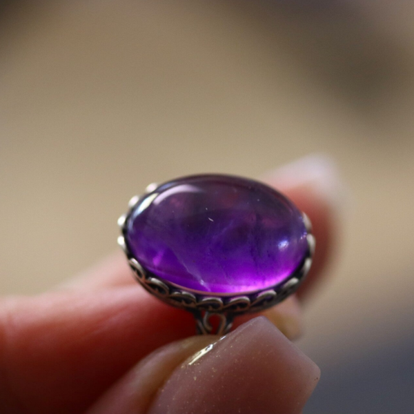 Ring met een amethist steen van 2 bij 1.4 cm. De steen is gezet in een Sterling zilveren omlijsting. De ring is verstelbaar in maat.