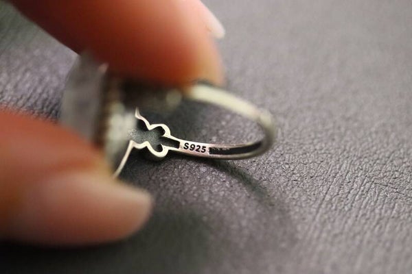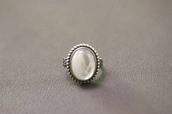 Ring met een maansteen van 1.7 bij 1.3 cm gezet in een versierde zilveren omlijsting. De ring is verstelbaar in maat.