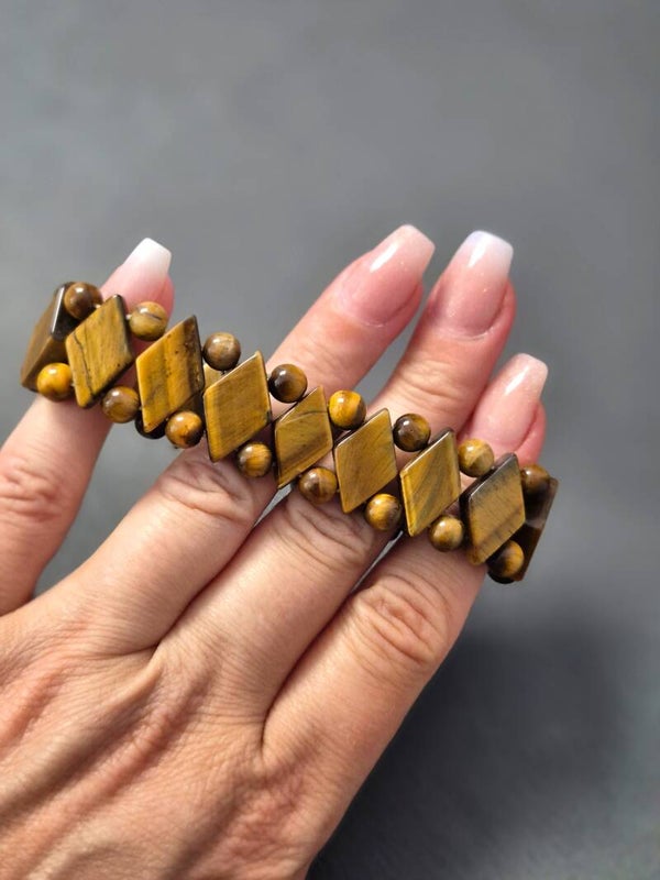 Soft bangle gemaakt met tijgeroogstenen bestaande uit ruitvormige en ronde kralen.