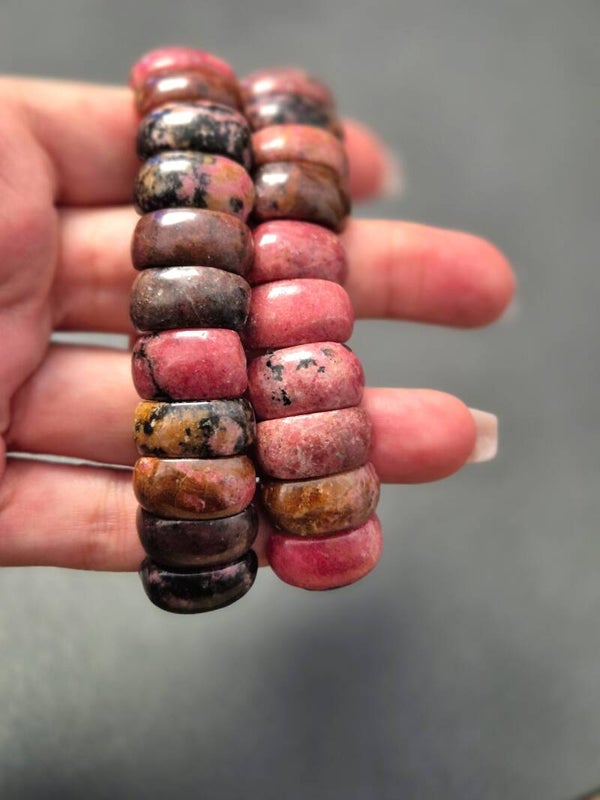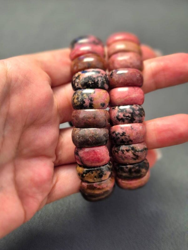 Een soft bangle van rhodoniet, roze met zwart. Er bevindt zich een natuurlijke druze in een van de segmenten. DIt is te zien op de laatste foto. Rhodoniet is een prachtige roze tot roodachtige edelsteen, vaak met zwarte aders of vlekken die het een uniek uiterlijk geven. Het is een mangaanhoudend mineraal dat voornamelijk wordt gevonden in landen zoals Rusland, Zweden, Duitsland, Mexico en Brazilië. De naam "rhodoniet" komt van het Griekse woord rhodon, wat "roos" betekent, verwijzend naar de roze kleur van de steen.