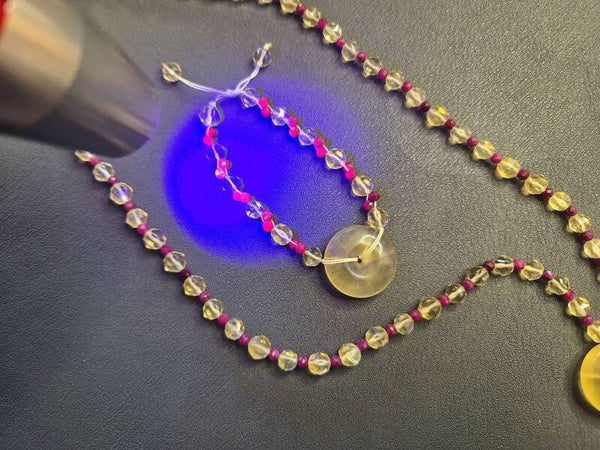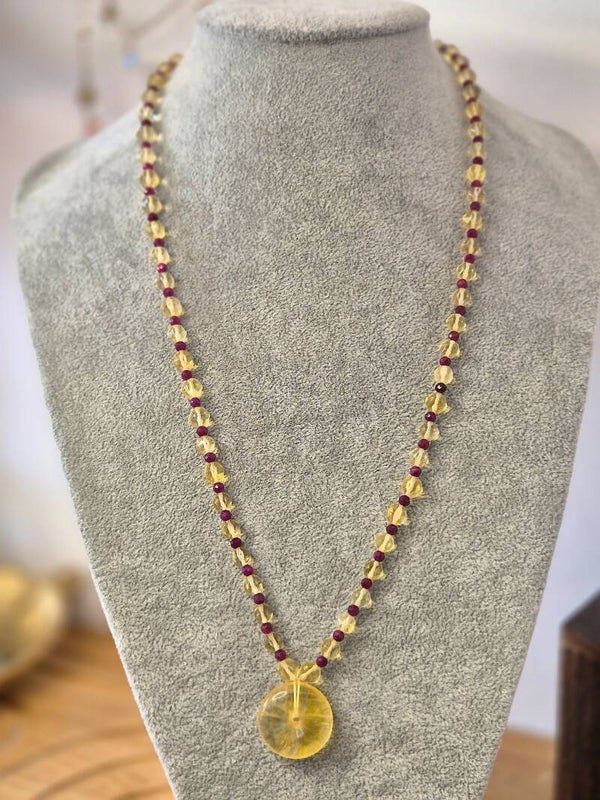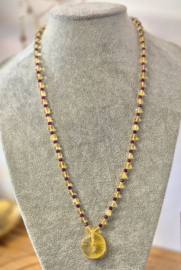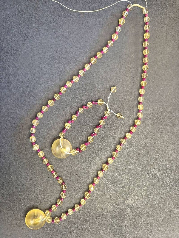 Set van geel fluoriet met grootte 6 mm afgewisseld met gefacetteerde natuurlijke robijnkralen van 3 mm. Robijn fluoriseert onder UV. Als hanger is een donut van geel fluoriet gebruikt van 2.5 cm in grootte. De ketting is zo een 70 cm lang en te verstellen tot 75 cm. Bij de ketting hoort ook een armband gemaakt van eenzelfde soort edelstenen.