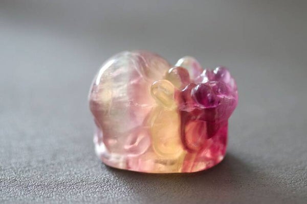 Met de hand gesneden pixiu van hoogwaardige fluoriet met paarsgele kleur. Aan de onderkant van dit beeldje is een geluks munt gekerfd. De afmetingen zijn: 4 x 2.8 x 2.8 cm.
