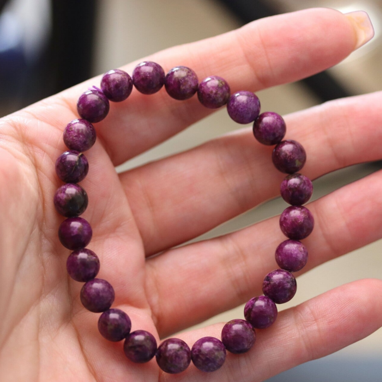 Prachtige kleur paars heeft deze armband van stichtiet. De grootte is 7 mm.