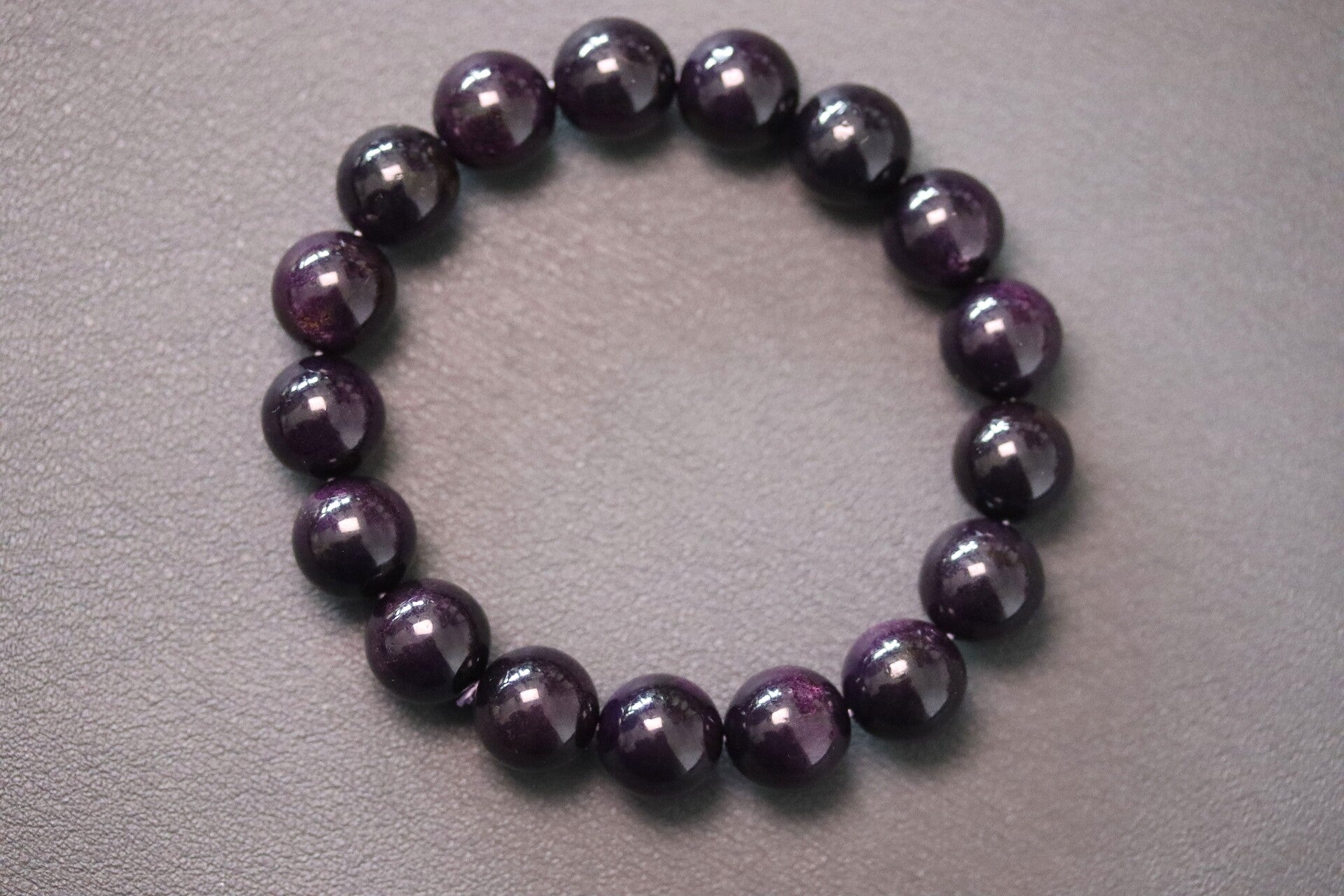 Prachtige dieppaarse armband met kralen van 12+ mm groot. Deze armband is van hoogwaardige kwaliteit en bevat geen witte inclusies. Een echte aanvulling voor je verzameling! Geweldige flash in zonlicht of kunstlicht.