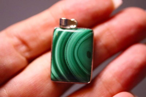 Rechthoekige hanger van malachiet met een omlijsting en oogje van messing. Afmetingen: 2.3 x 1.7 x 0.57 cm