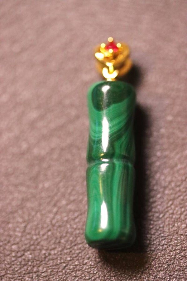 Hanger van malachiet met een goudkleurig oogje van messing. Afmetingen: 2.6 x 0.8 cm