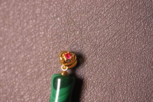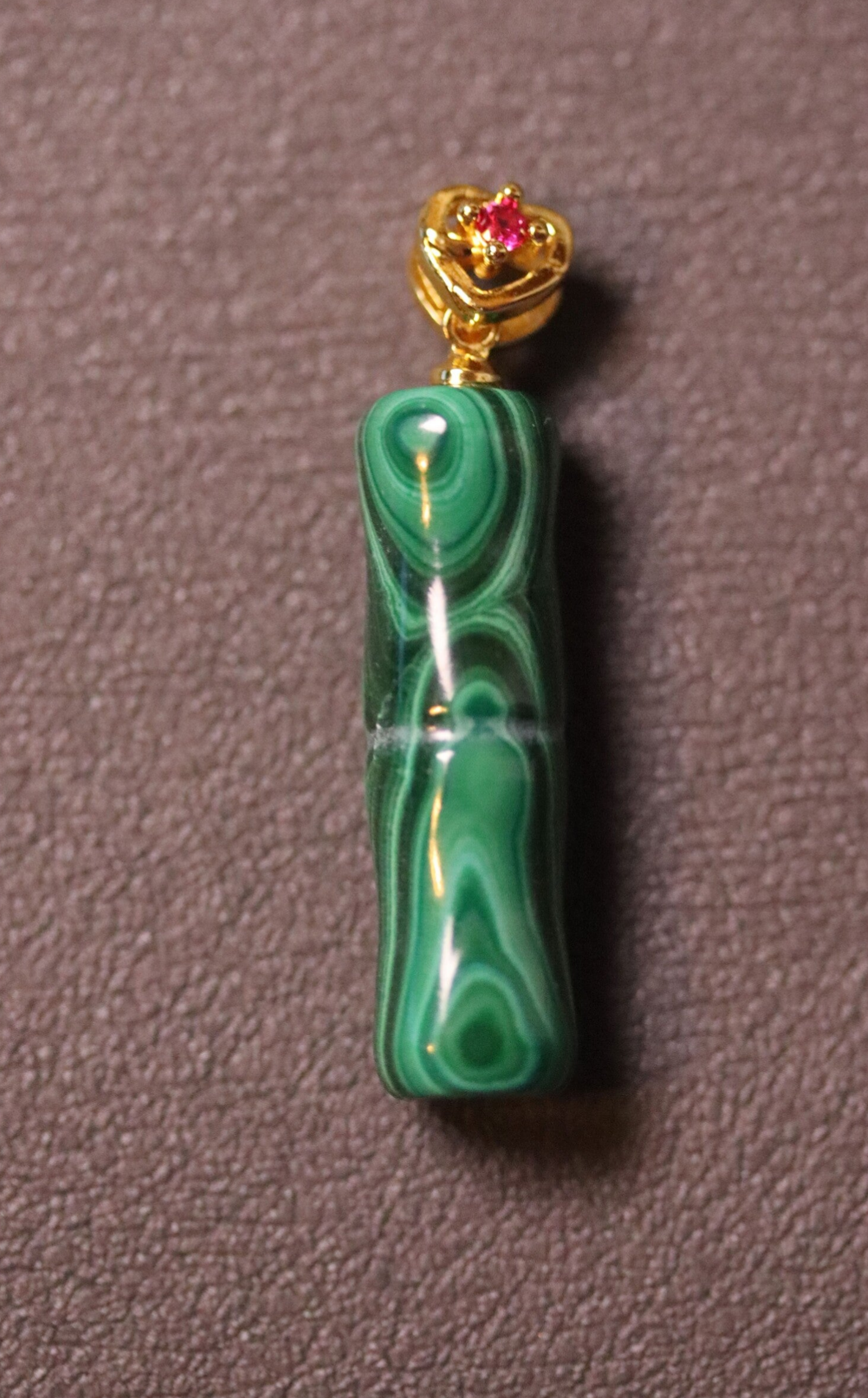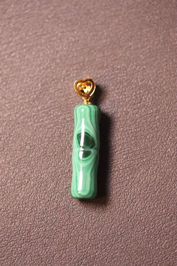 Hanger van malachiet met een goudkleurig oogje van messing. Afmetingen: 2.6 x 0.8 cm