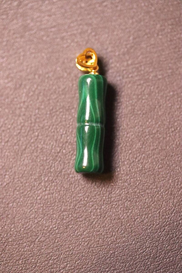 Hanger van malachiet met een goudkleurig oogje van messing. Afmetingen: 2.6 x 0.8 cm