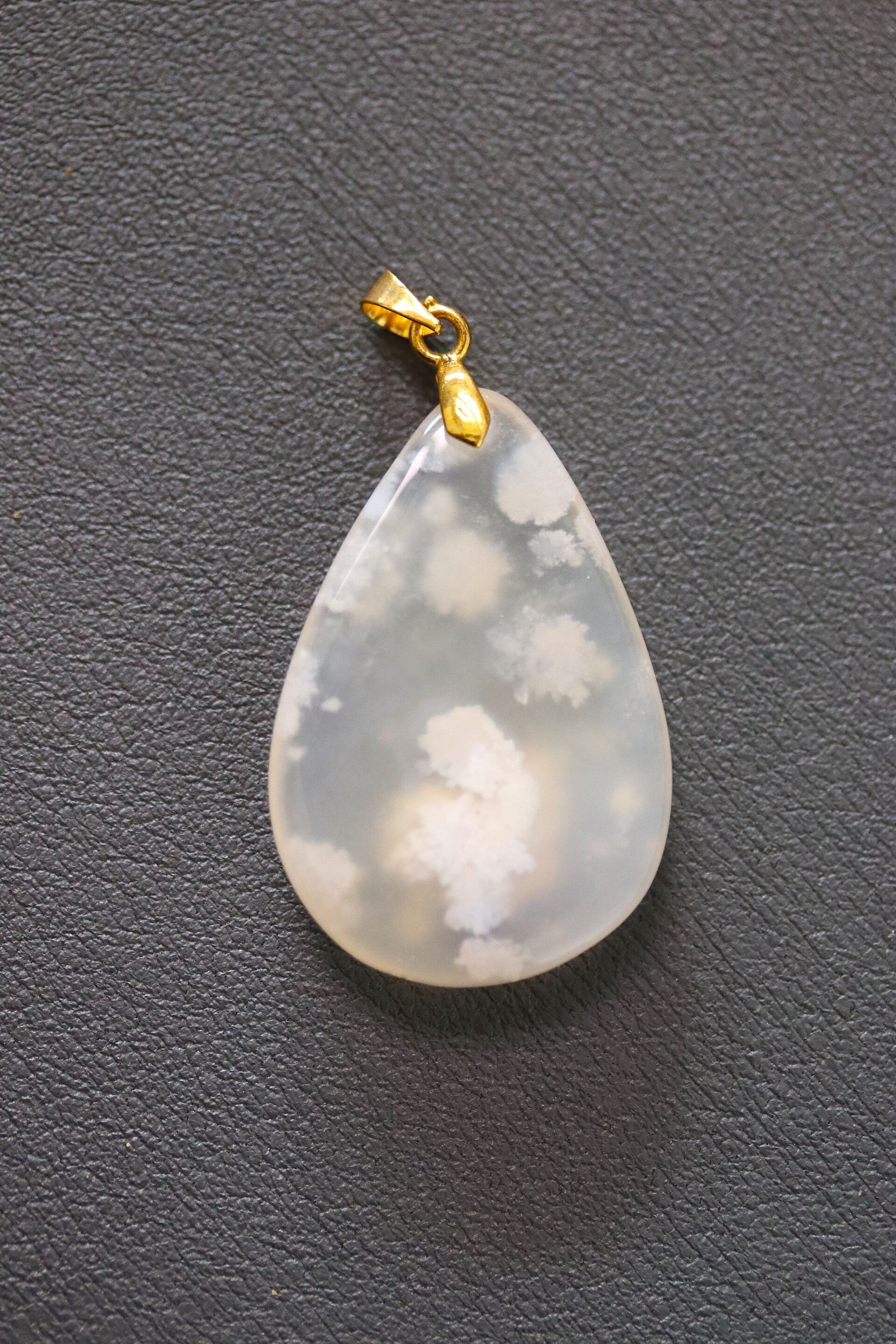 Hanger van bloemagaat in druppelvorm met afmeting van 3.7 x 2.4 x 0.6 cm. Deze hanger heeft een goudkleurig oogje van messing.