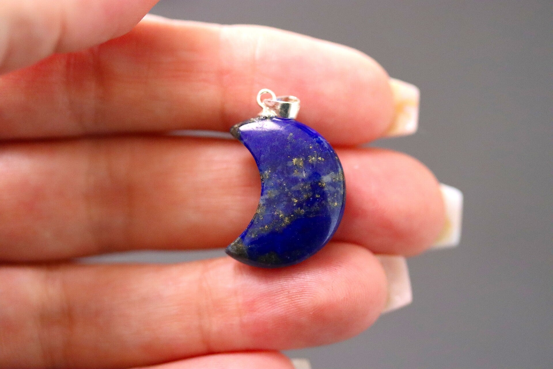 Hanger van lapis lazuli in de vorm van een maan met afmetingen 2.0 x 1.6 cm. Het oogje is van sterling zilver S925.