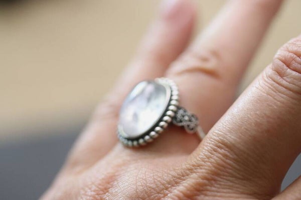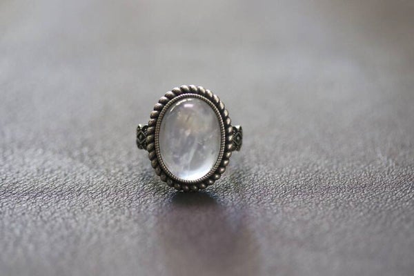 Ring met een maansteen van 1.7 bij 1.3 cm gezet in een versierde zilveren omlijsting. De ring is verstelbaar in maat.