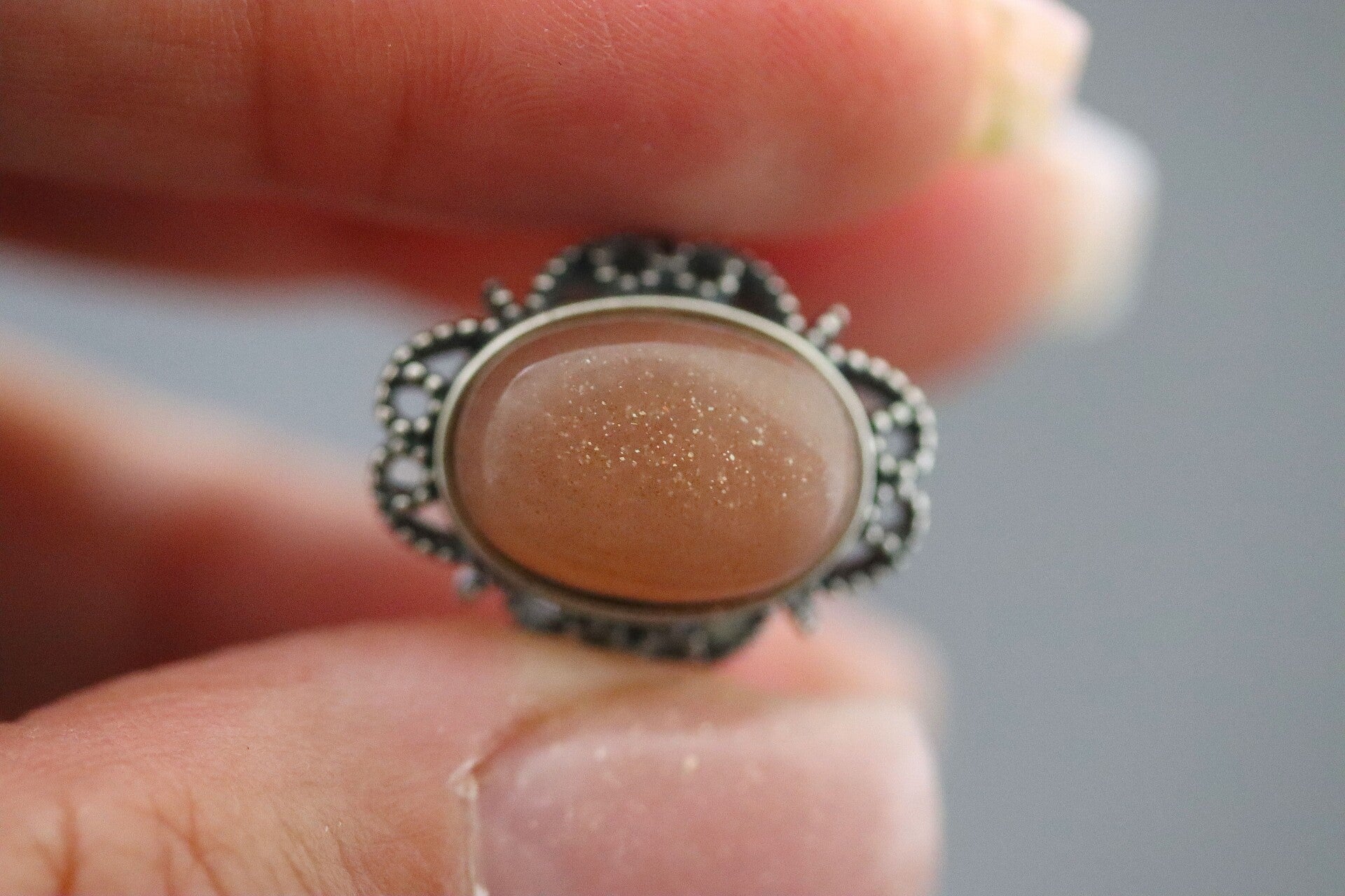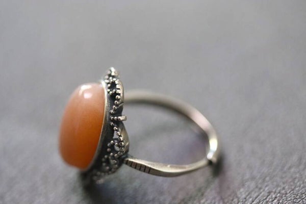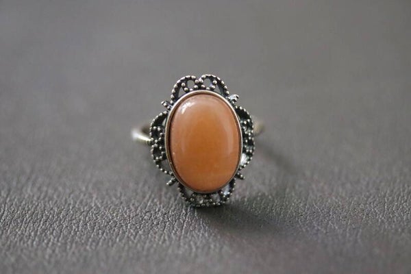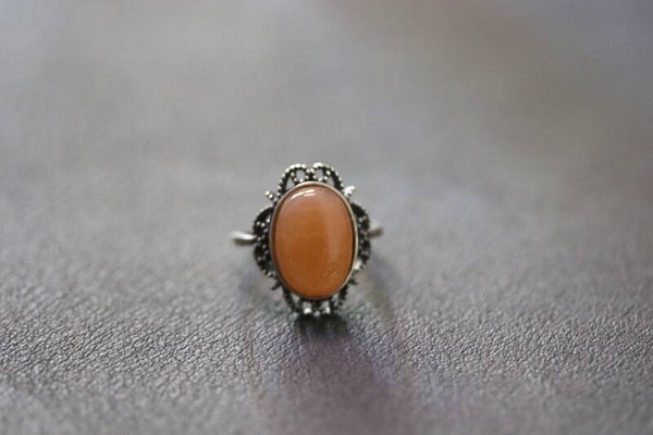 Ring gezet met een perzik maansteen met grootte van 1.4 x 1.0 cm. Heeft een prachtige glans. De ring is in maat verstelbaar.
