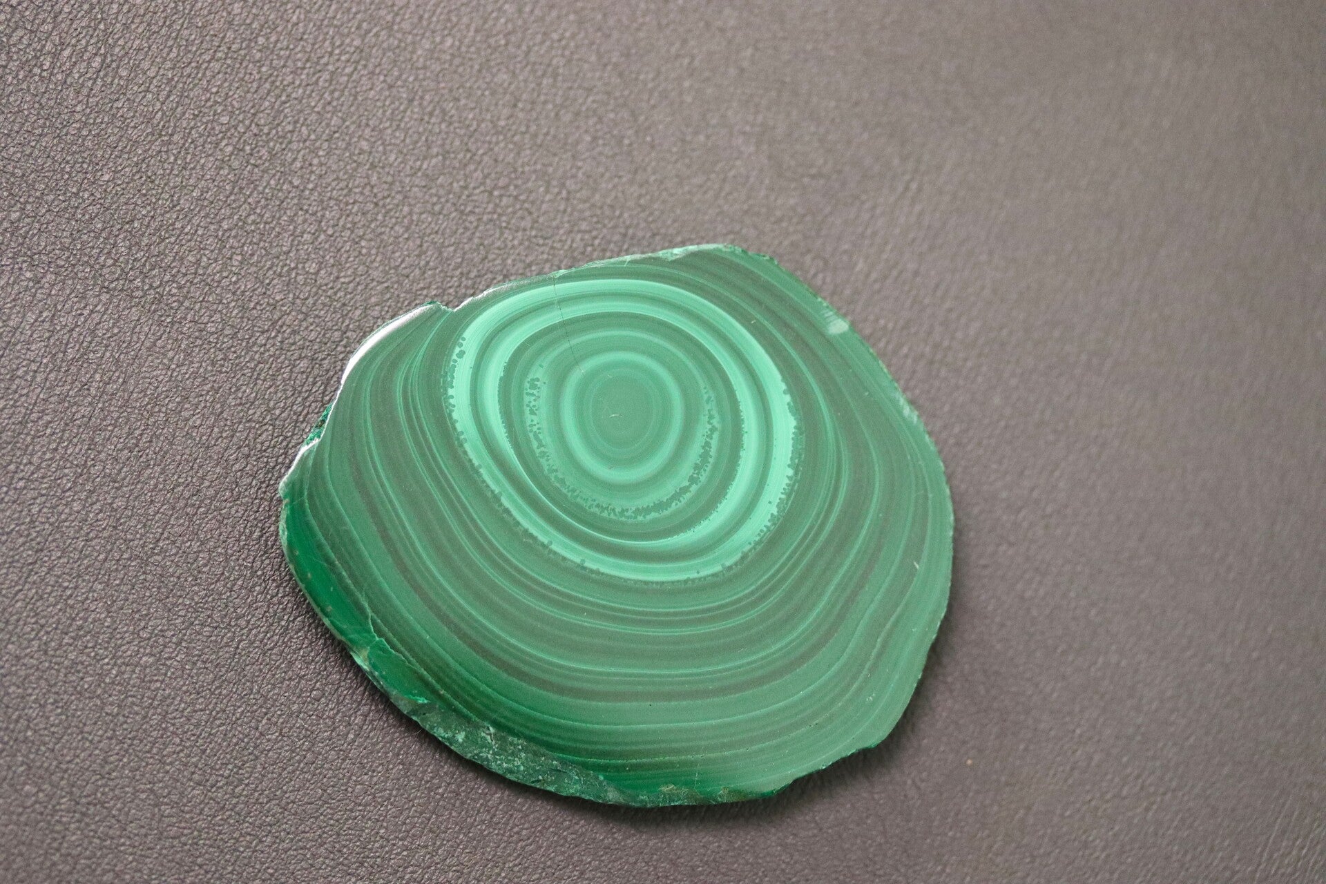 Plak van malachiet met afmetingen van 6.2 x 5.2 x 0.6 cm en 55 gram.