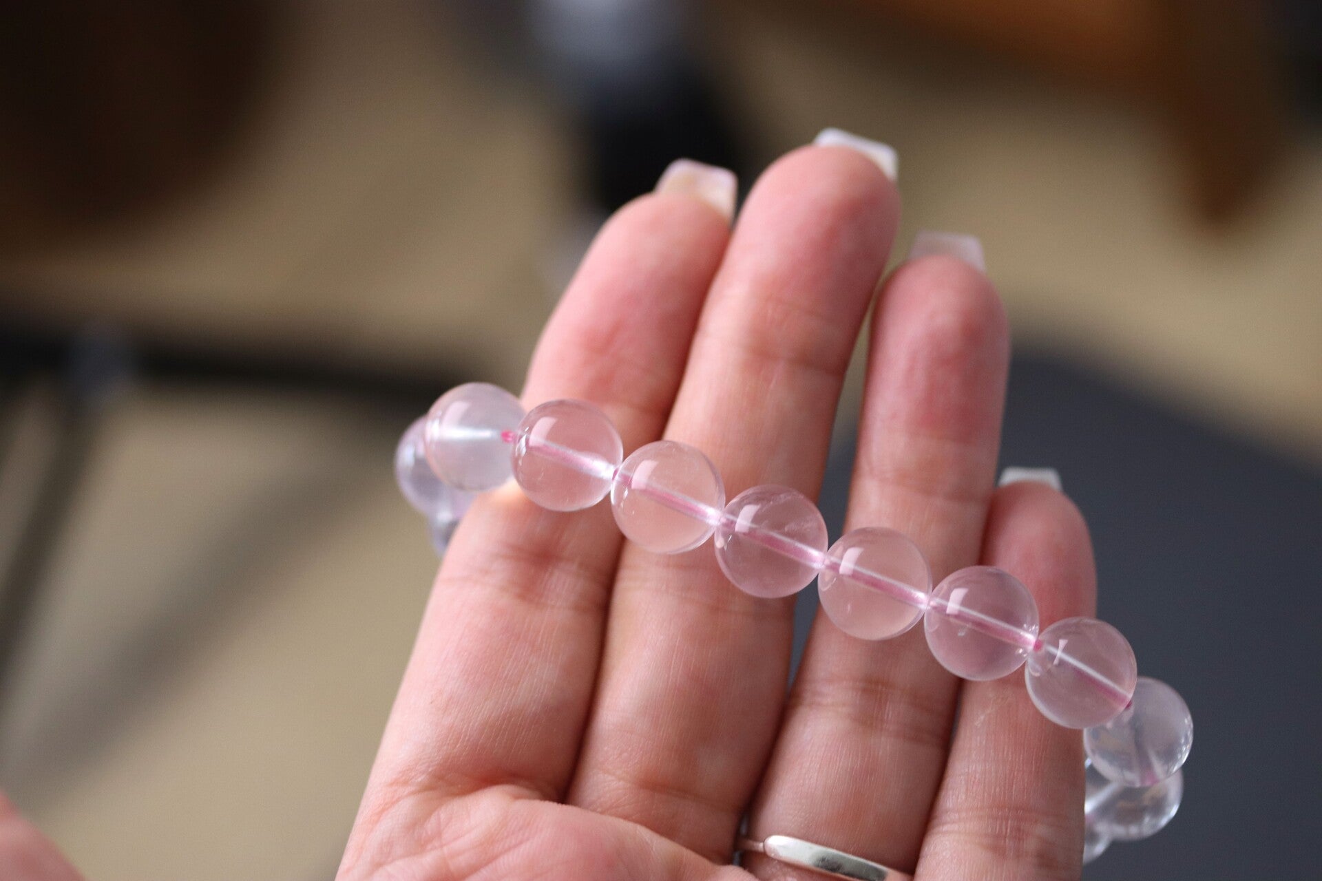 Armband met kralen van rozenkwarts van 11+ mm in afmeting. Wanneer er een sterke lichtbron op de kralen valt ontstaat er een kattenoog effect dat wordt gezien als een ster.
