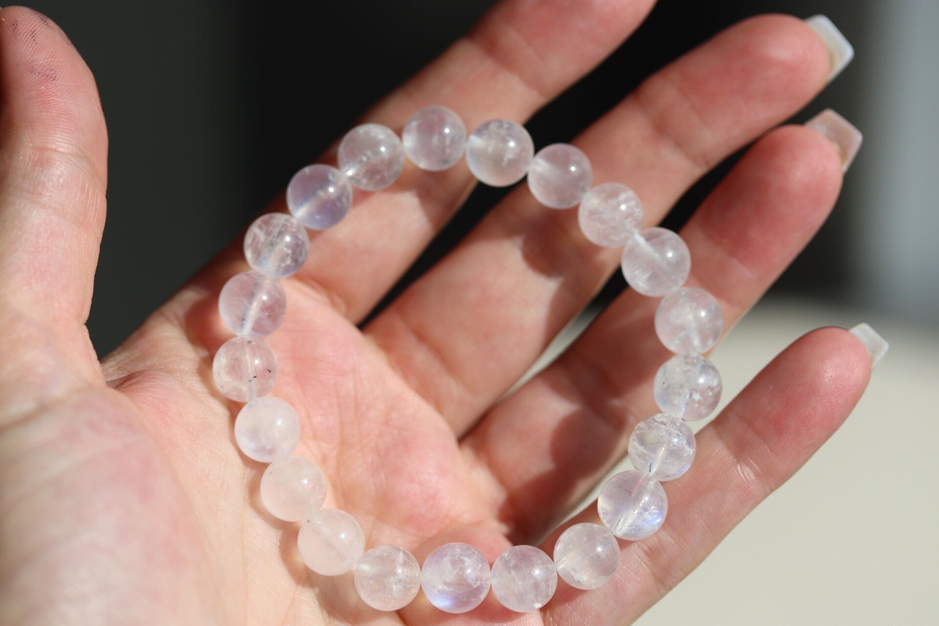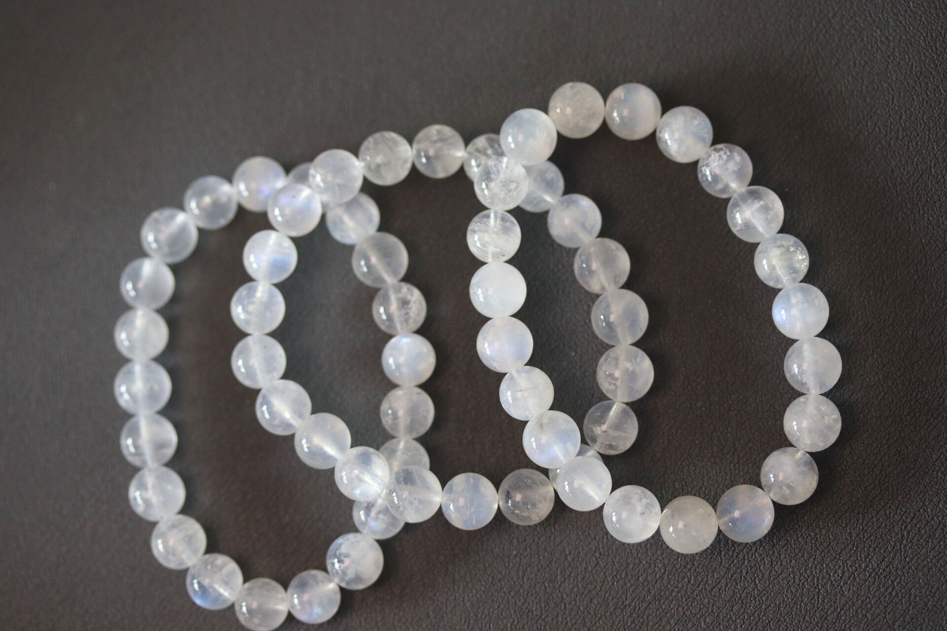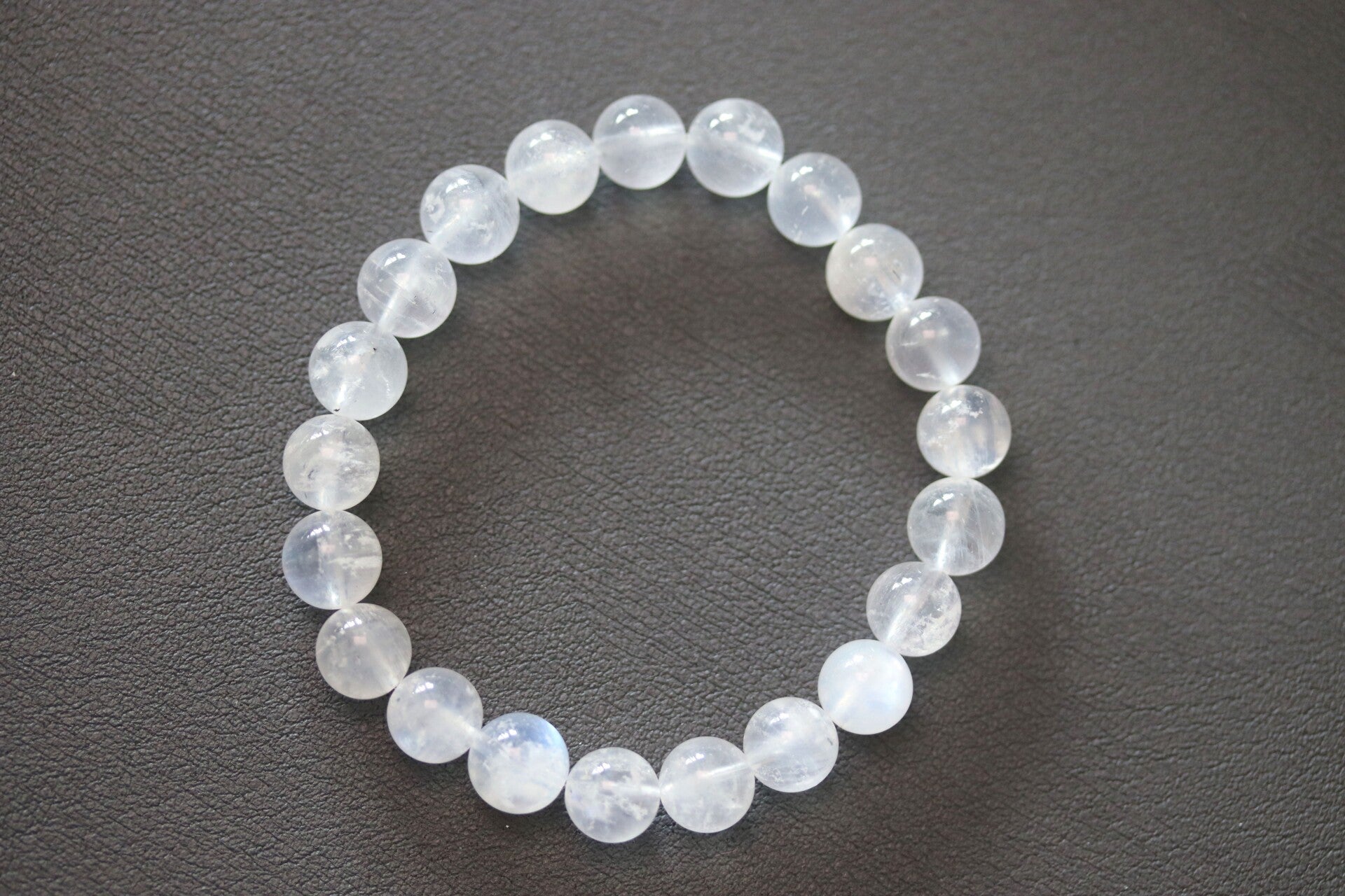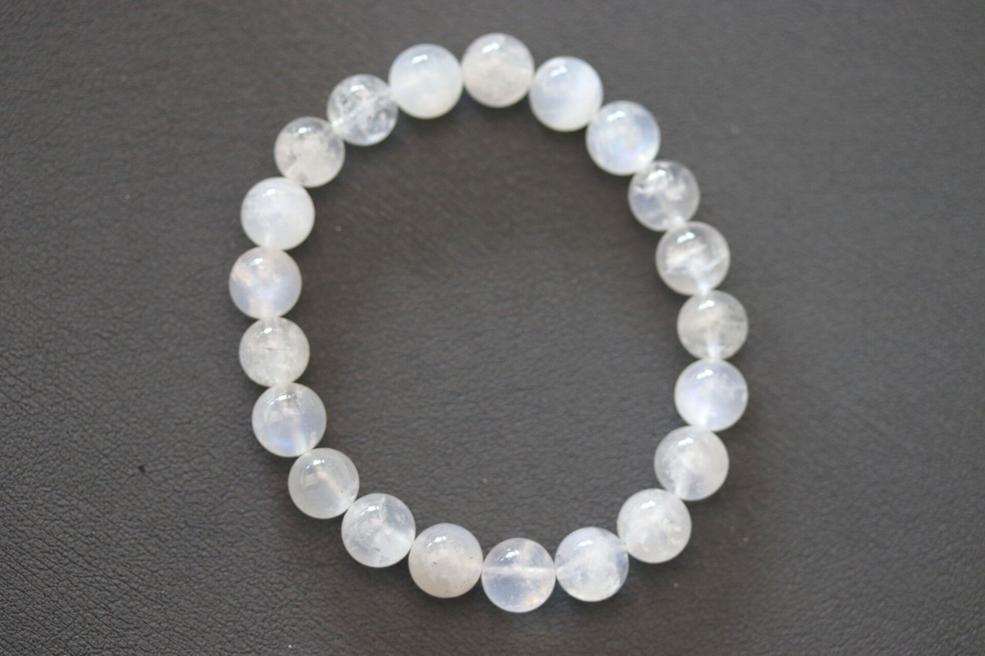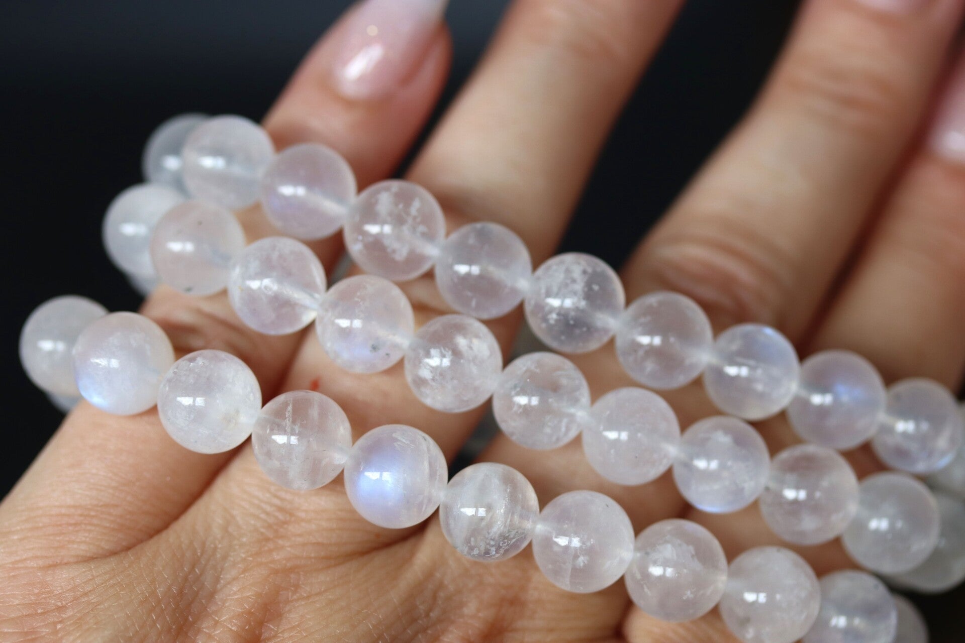 Armband van blauwe maansteen. De grootte van de kralen is 9 mm. Bij aankoop krijg je één van de afgebeelde armbanden geleverd. Van goede kwaliteit; mooi transparant en weinig zwarte inclusies en goede flash.
