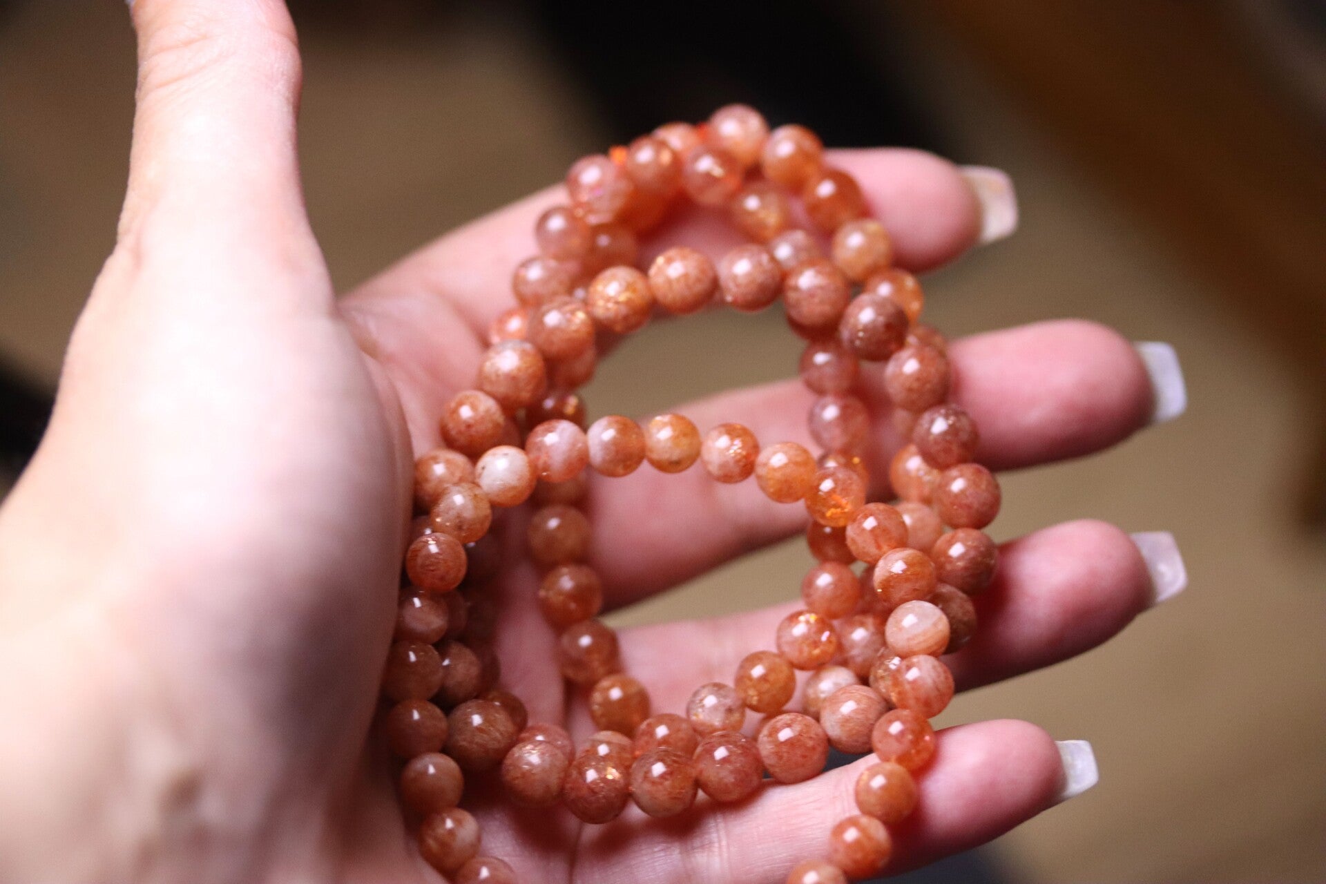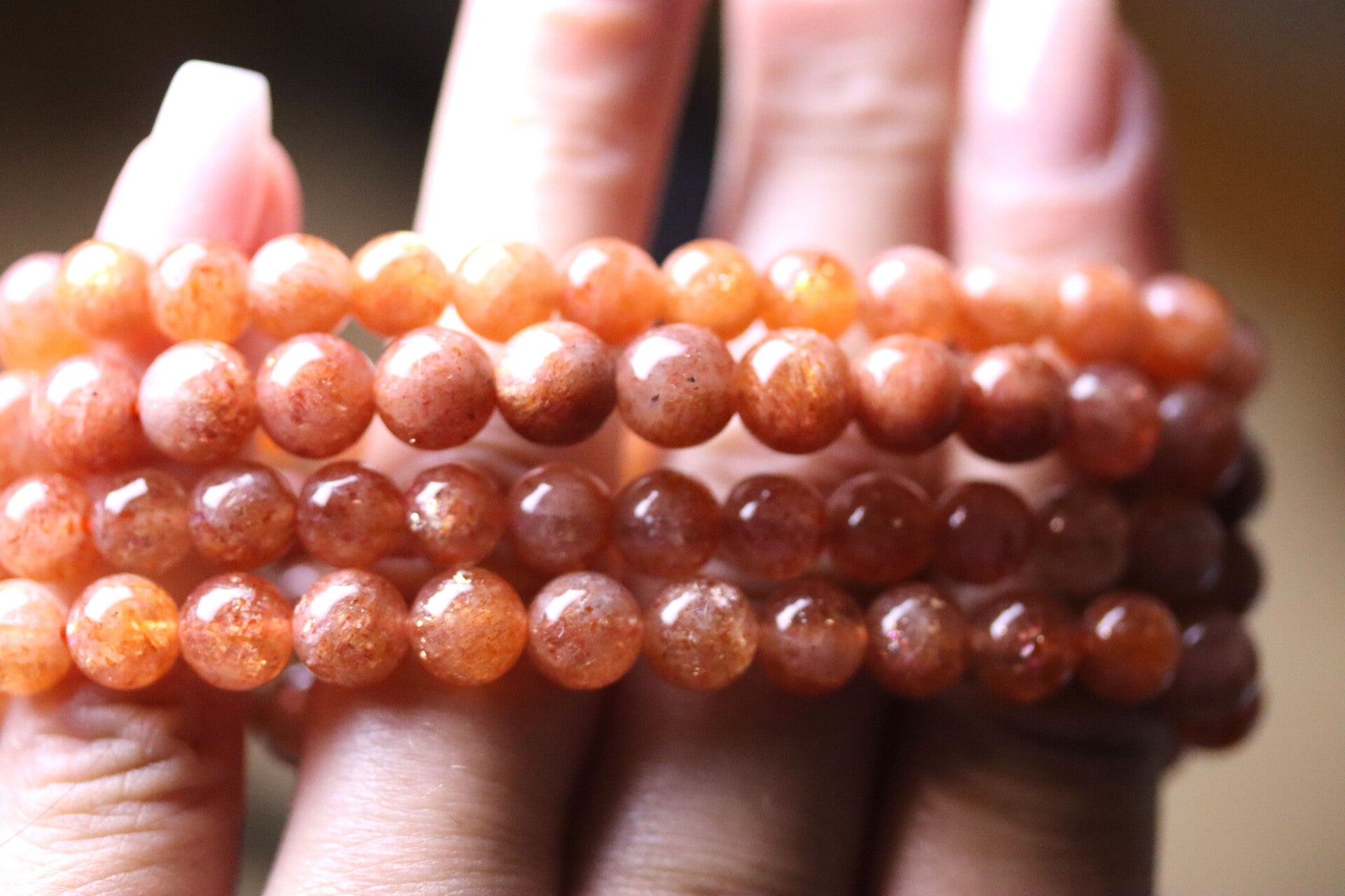Super mooie armband van gouden zonnesteen. Mooie donkere kwaliteit. Heeft prachtige schitteringen wanneer licht op de kralen valt. De grootte van de kralen zijn 6 mm.