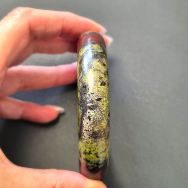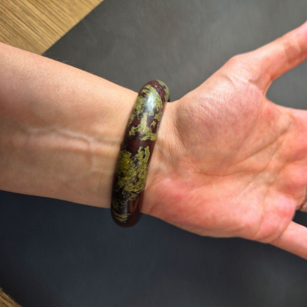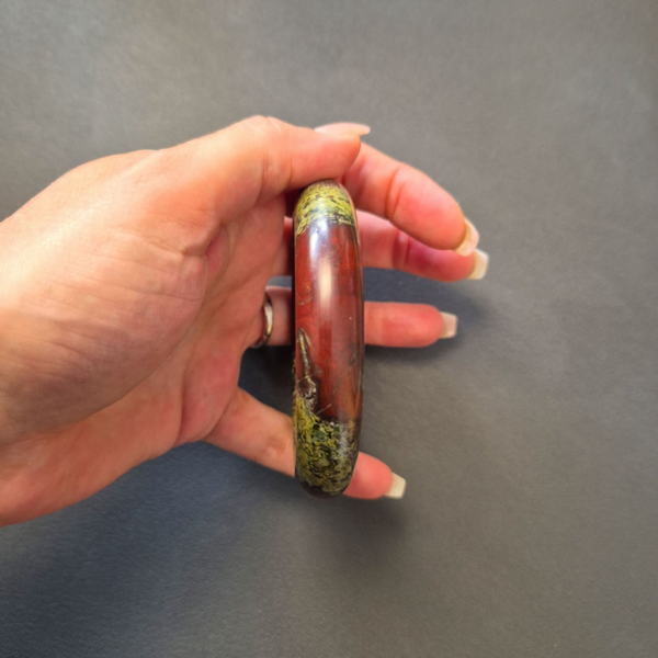 Hard bangle van drakenbloed jaspis met diameter van 64.1 mm.