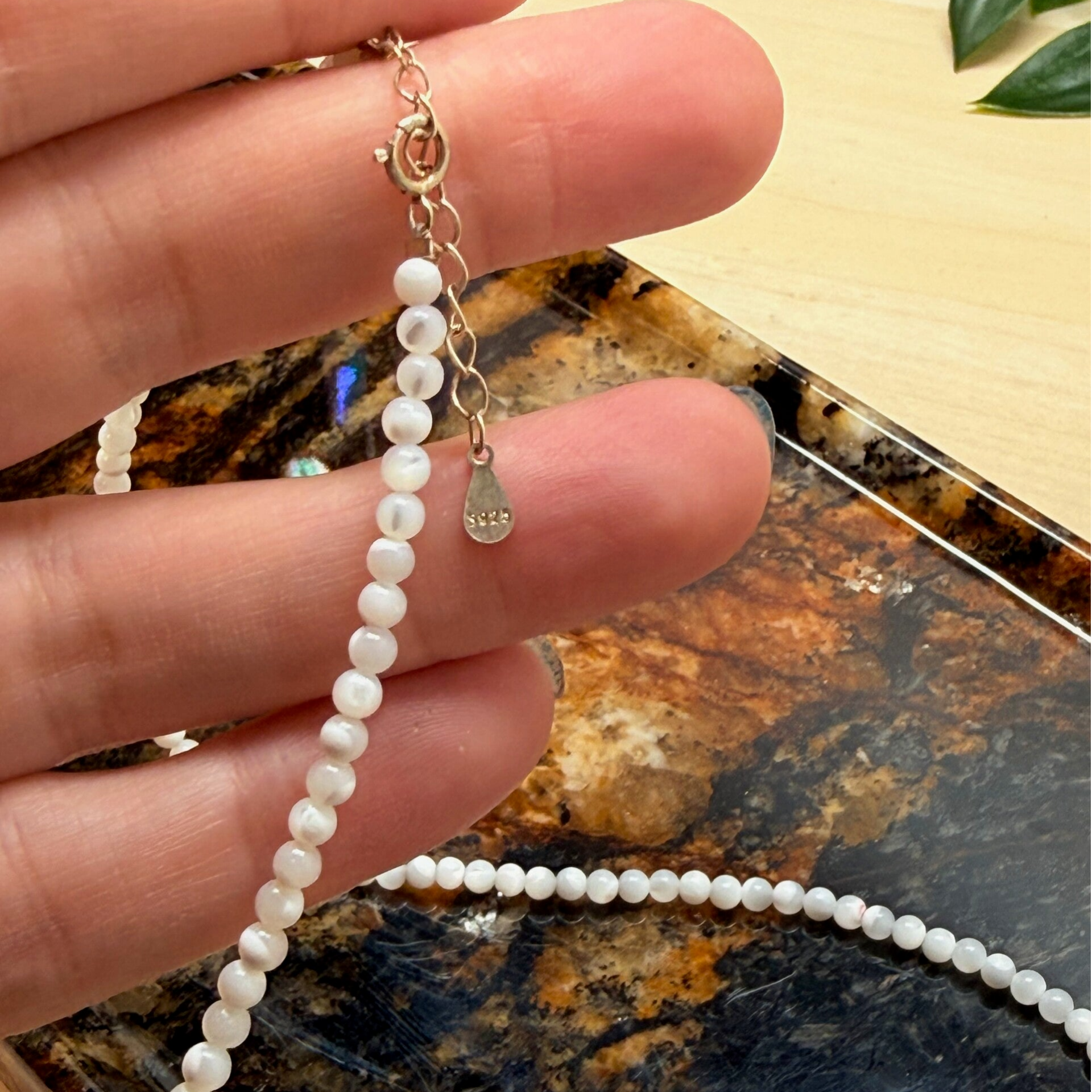 Lieve ketting met beertje gemaakt van witte schelp van 3 mm in afmeting. De sluiting is gemaakt van zilver S925 en de ketting is 40-45 cm lang met verstelbare sluiting.