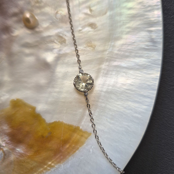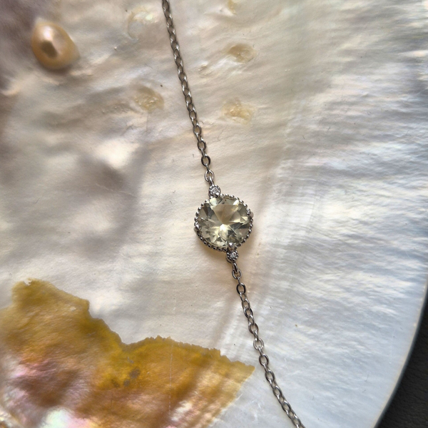 Subtiel, verfijnd en vol natuurlijke charme – deze zilveren armband met prasioliet is een ode aan zachte elegantie. De centrale 8 mm ronde, gefacetteerde prasioliet vangt het licht met een serene glans en straalt een kalme, groene energie uit. Gezet in puur 925 sterling zilver, vormt deze armband een tijdloos sieraad dat moeiteloos past bij elke stijl.