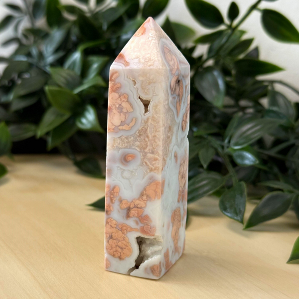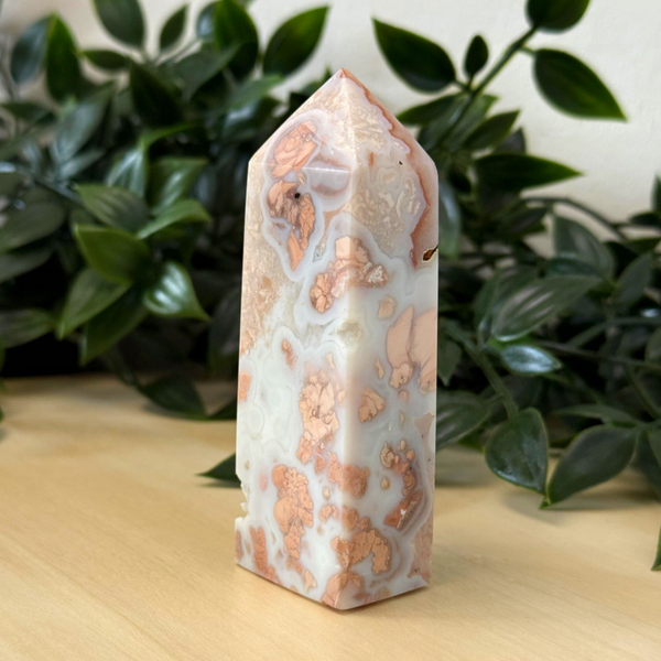 Een type brecciated jaspis met insluitsels van chalcedoon en druzy kwarts. De toren heeft een hoogte van circa 9.5 cm en weegt 150 gram.