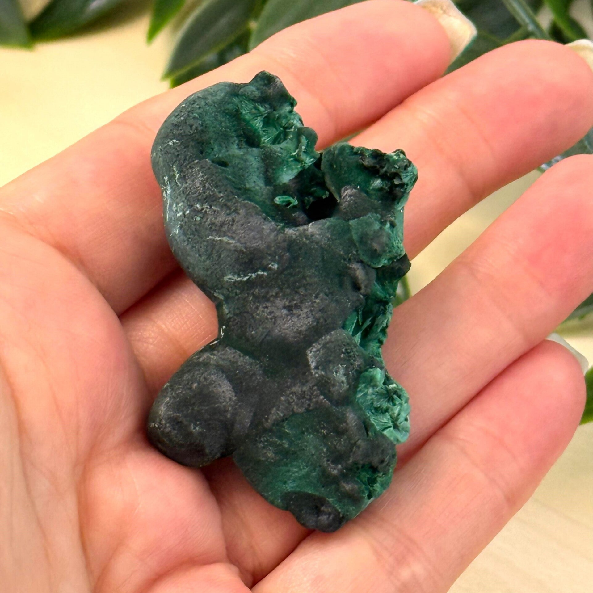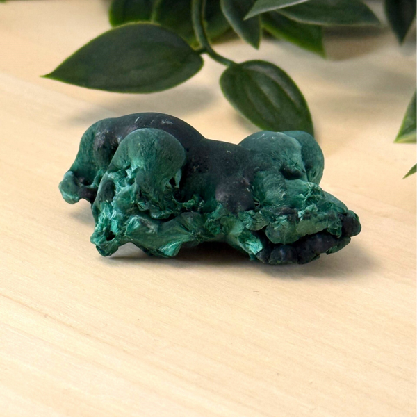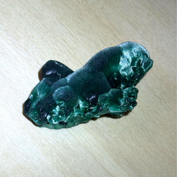 Fluweel botryoïdale malachiet uit Congo is een adembenemende verschijning uit de wereld van mineralen. Deze bijzondere variant van malachiet wordt gekenmerkt door haar zijdeachtige glans en afgeronde druifachtige structuren—alsof Moeder Natuur een tapijt van groene fluweel heeft geweven in de grotten van Afrika. De beste exemplaren komen uit de mijnen van Katanga (Democratische Republiek Congo), een regio beroemd om haar rijke koperlagen. Malachiet ontstaat hier wanneer koperhoudende vloeistoffen reageren met kalksteen of andere carbonaatrijke gesteenten, waarbij het mineraal in vezelachtige, afgeronde formaties neerslaat. De groene kleur varieert van smaragdgroen tot diep bosgroen. De “fluweelachtige” textuur is te danken aan minuscule vezels die licht diffuus reflecteren. Botryoïdale vormen—van het Griekse botrys, “druiventros”—maken elk exemplaar uniek: soms grillig, soms perfect rond.