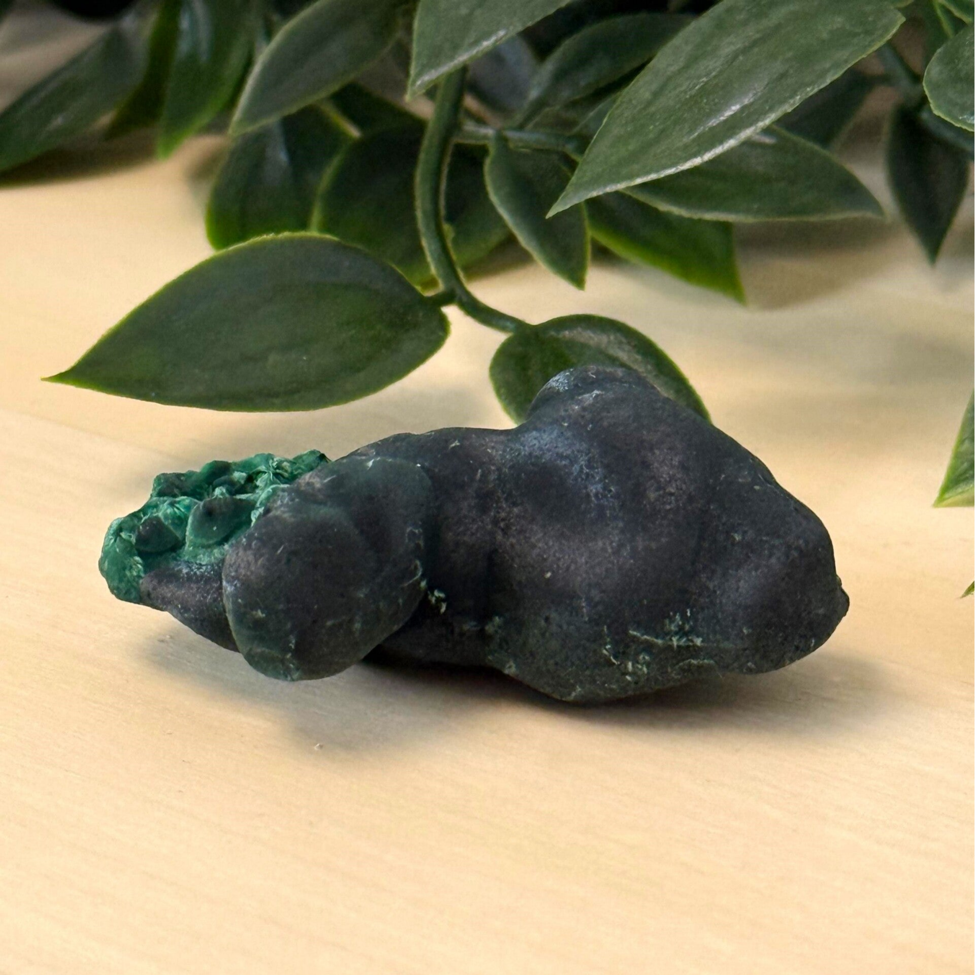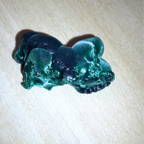 Stukje fluweel botryoïdale malachiet met grootte van 5.2 x 3.0 cm en gewicht van 50 gram. De twee laatste foto's laten de schoonheid van de malachiet zien wanneer er een lichtbron op wordt geschenen.