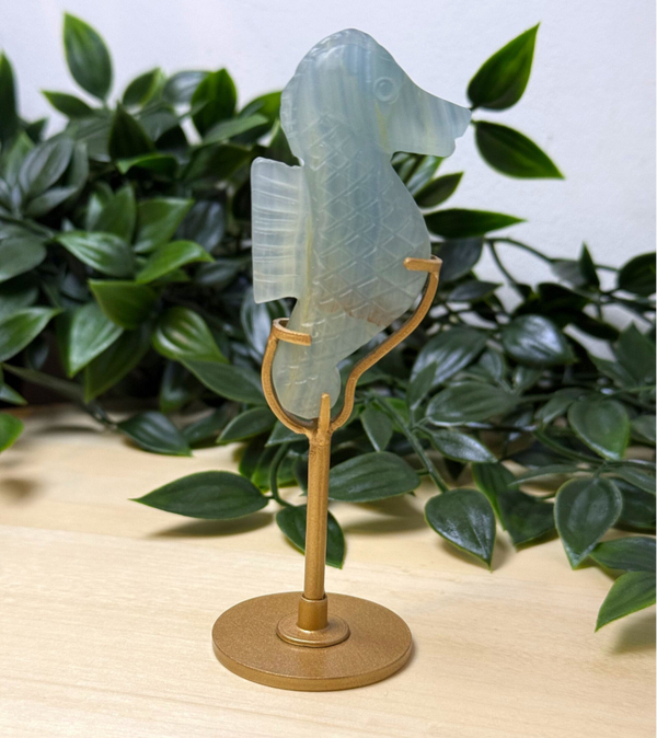 Te cute dit zeepaardje gemaakt van blauwe onyx en met de hand gemaakt. De carving is 12 cm hoog inclusief standaard. De prijs is inclusief houder.