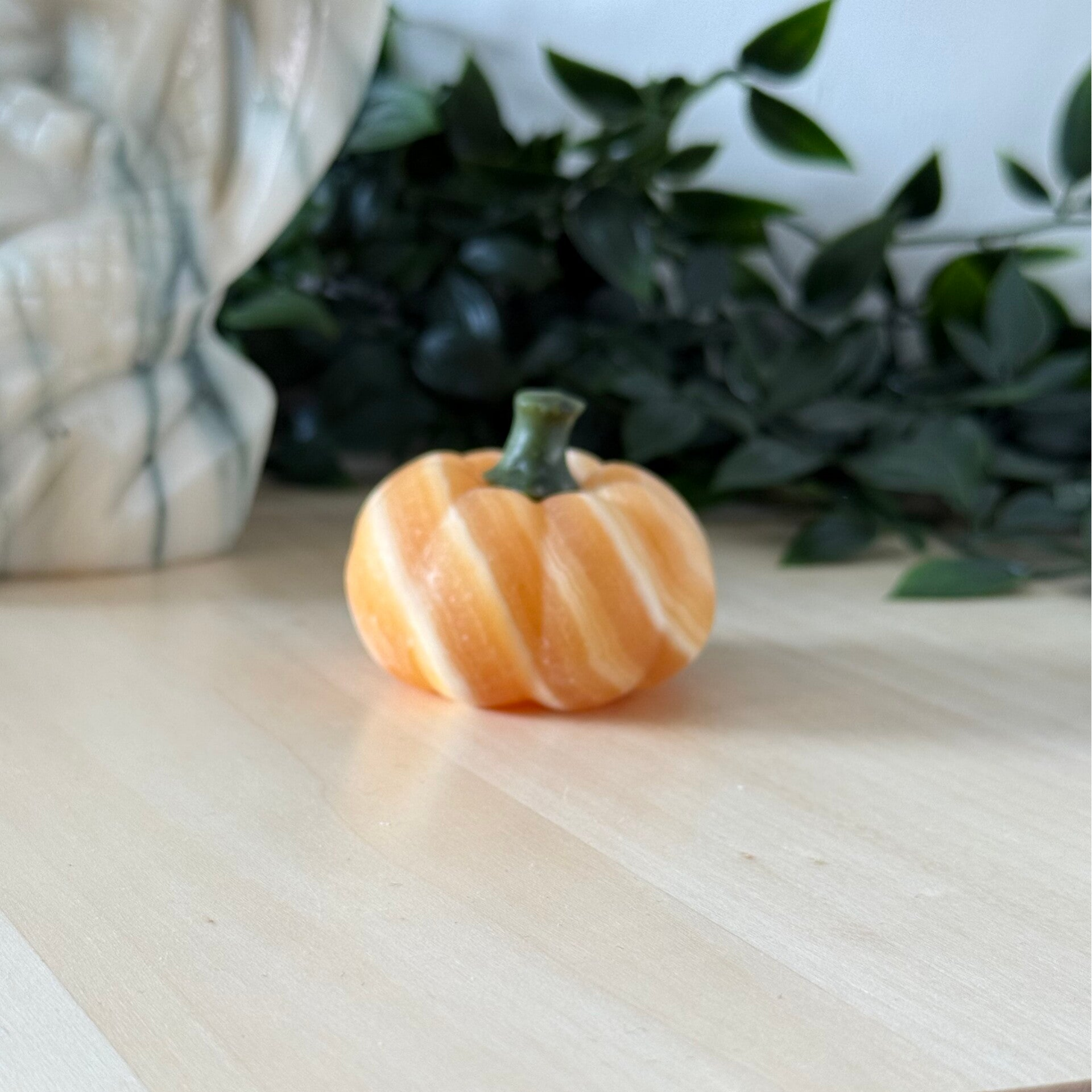 Pompoen van ruim 6 cm groot. Leuk voor Halloween of als herfstdecoratie. De pompoen is gemaakt van oranje calciet en heeft mooie streepvorming / banding.