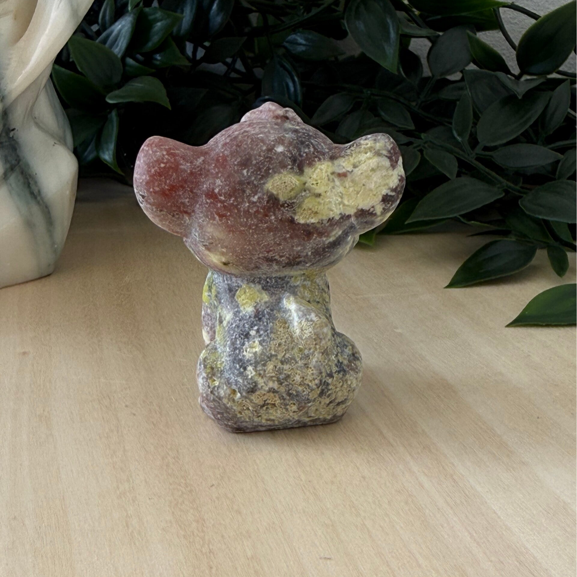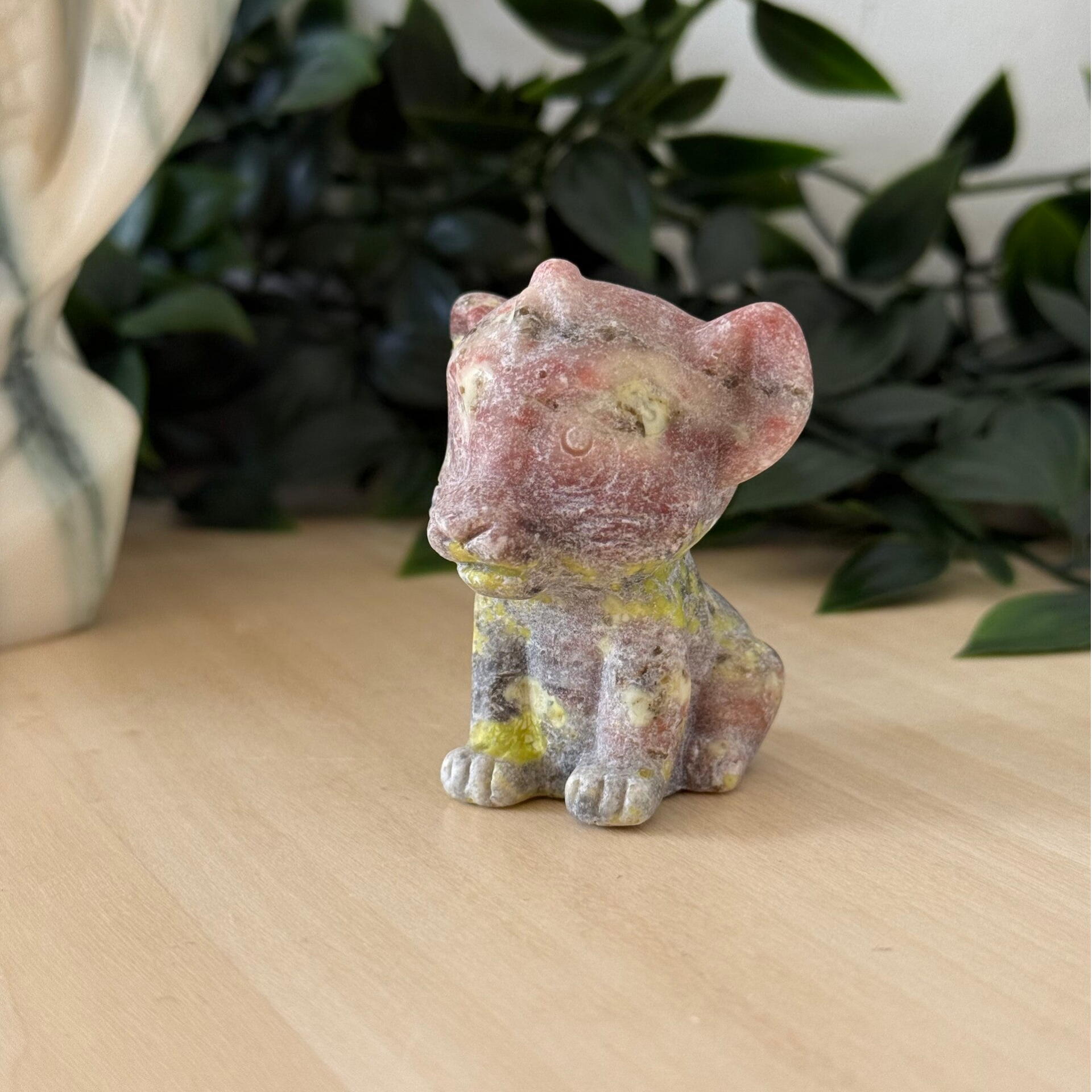 Het beeldje is zo een 6 cm hoog en heeft een roze en gele kleur.