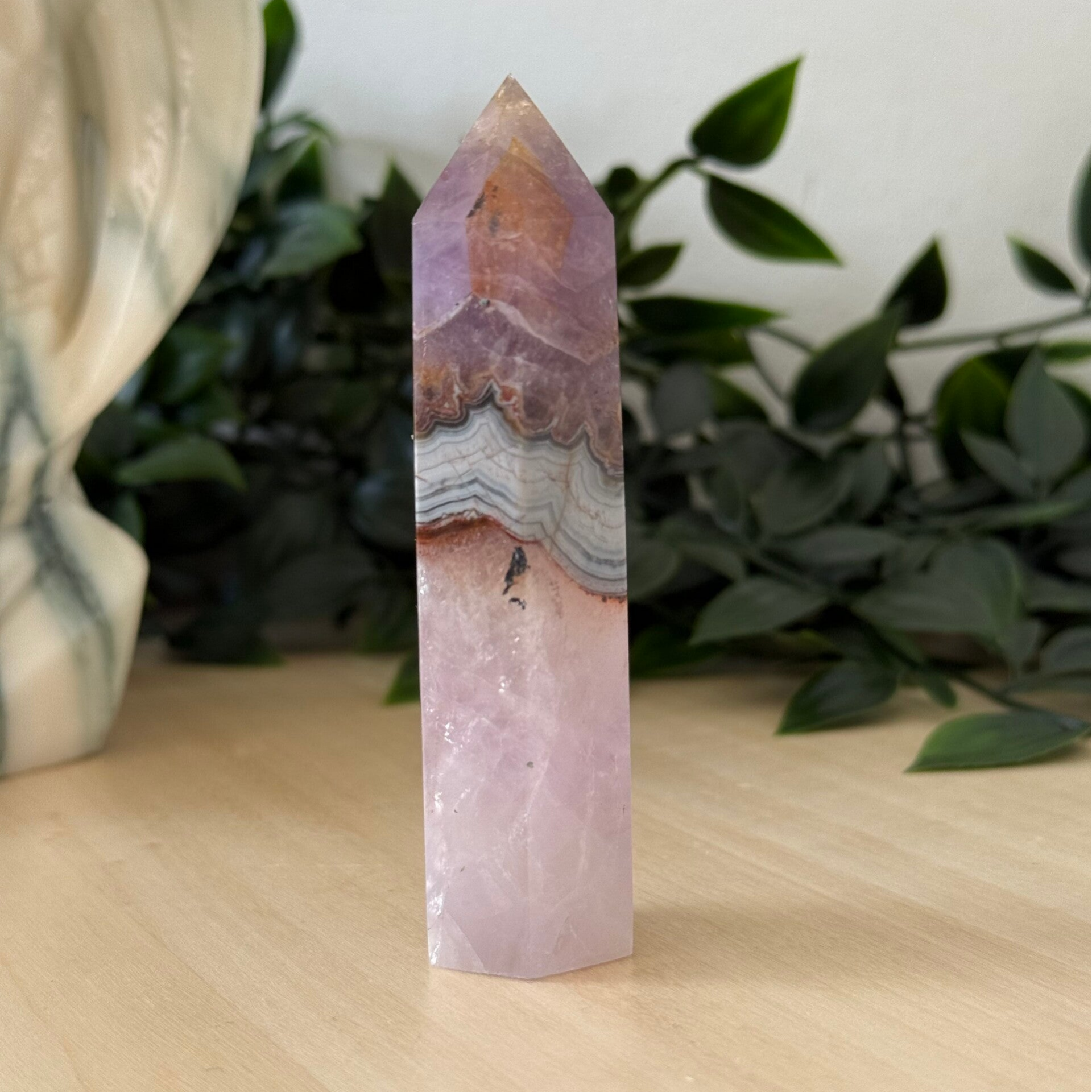 Een kleine toren van amethist met Mexicaanse lace agaat met hoogte van circa 10 cm.