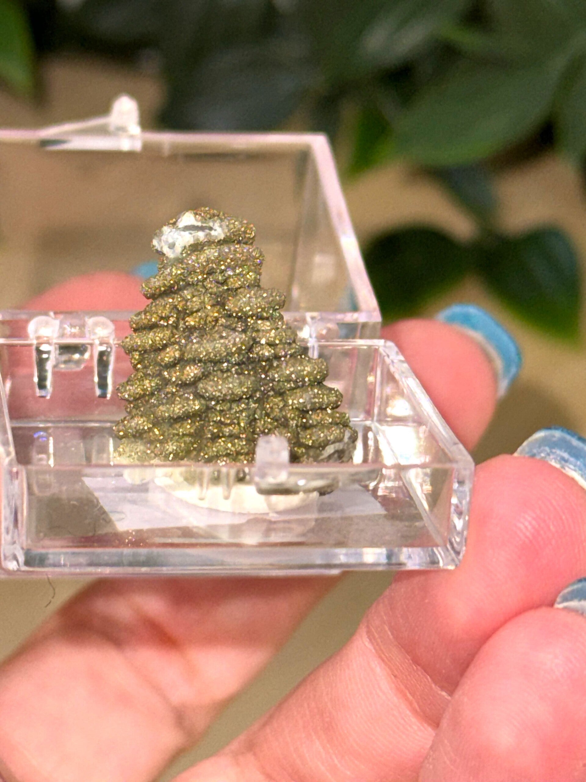 Een calciet pagode met iriserende pyriet is een zeldzaam en visueel spectaculair mineraalcluster waarin pagodevormige calcietkristallen zijn bedekt met glinsterende, regenboogkleurige pyriet. Deze combinatie komt vooral uit Hubei, China.